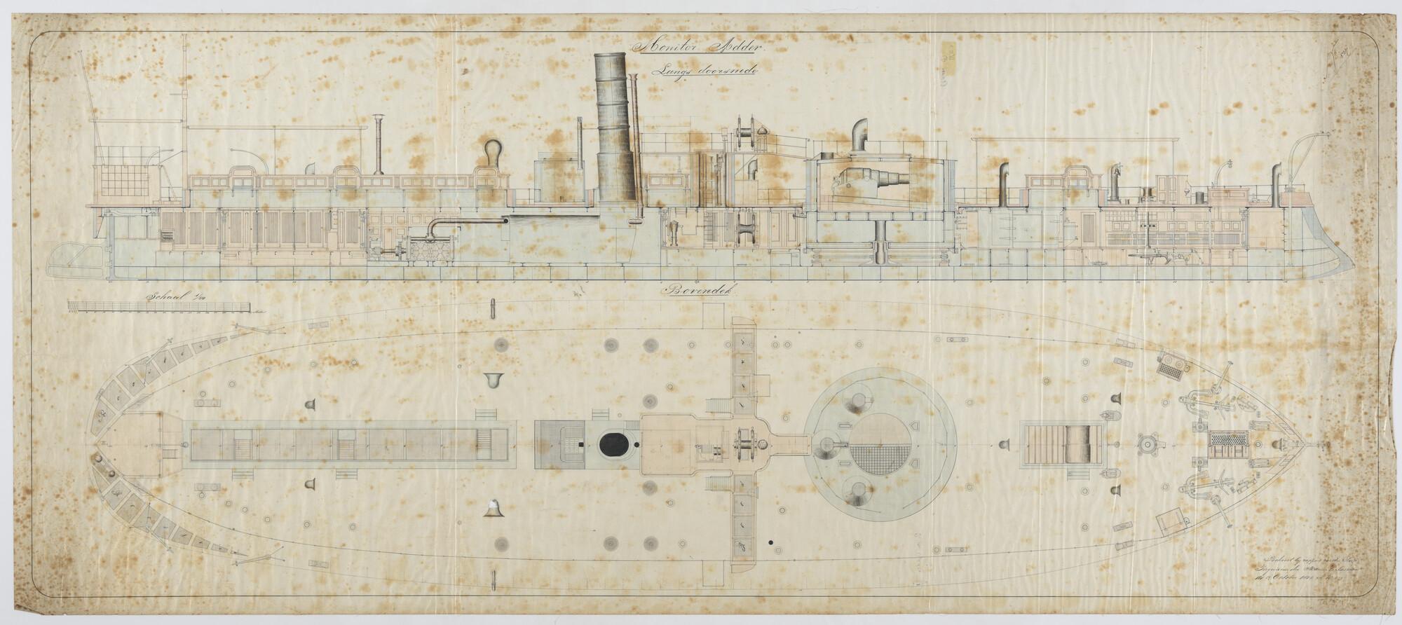 De rammonitor Zr.Ms. "Adder", 1870. verticale langsdoorsnede, bovenaanzicht.