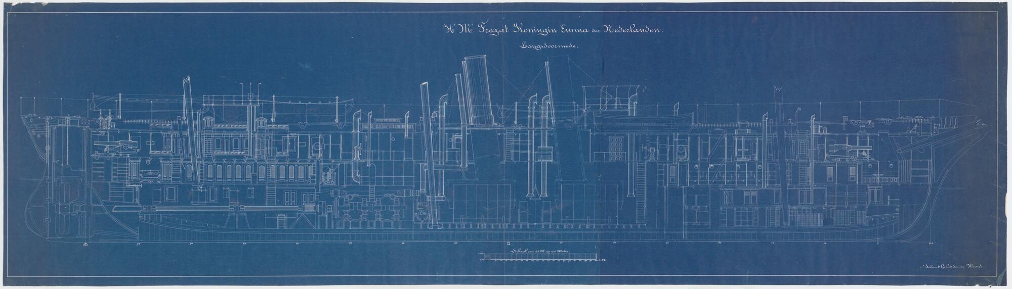 Het schroefstoomschip 1ste klasse Zr.Ms. "Koningin Emma'. verticale langsdoorsnede, horizontale langsdoorsnede, met pijpleidingen.
