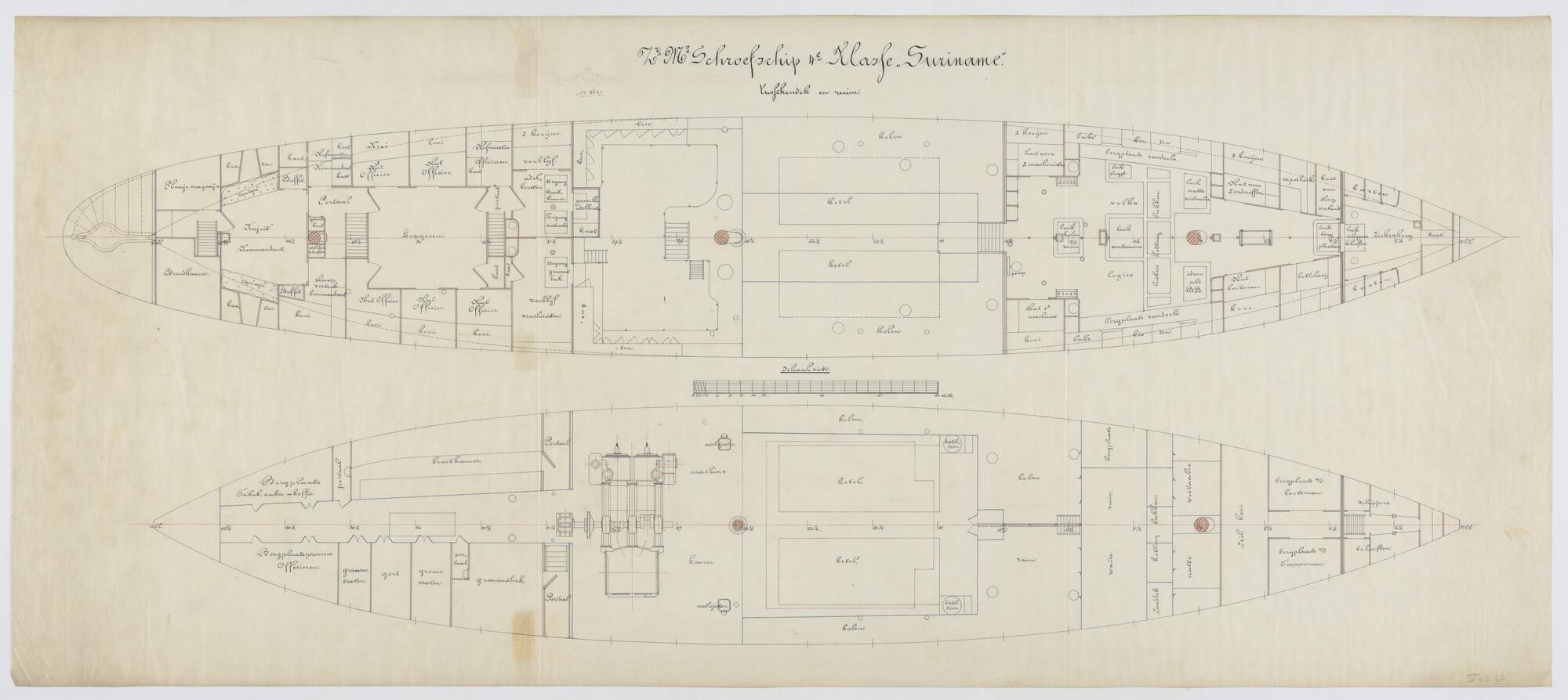 Het schroefstoomschip 4de klasse Zr.Ms. "Suriname", 1876. Tussendek en ruim.