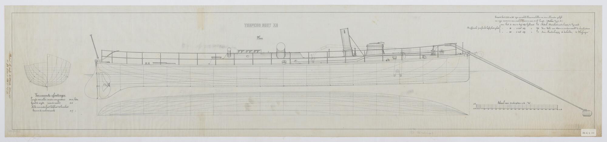 'Torpedoboot XII' 1878. Sparconstructie, spantenraam, waterlijnen, verticalen