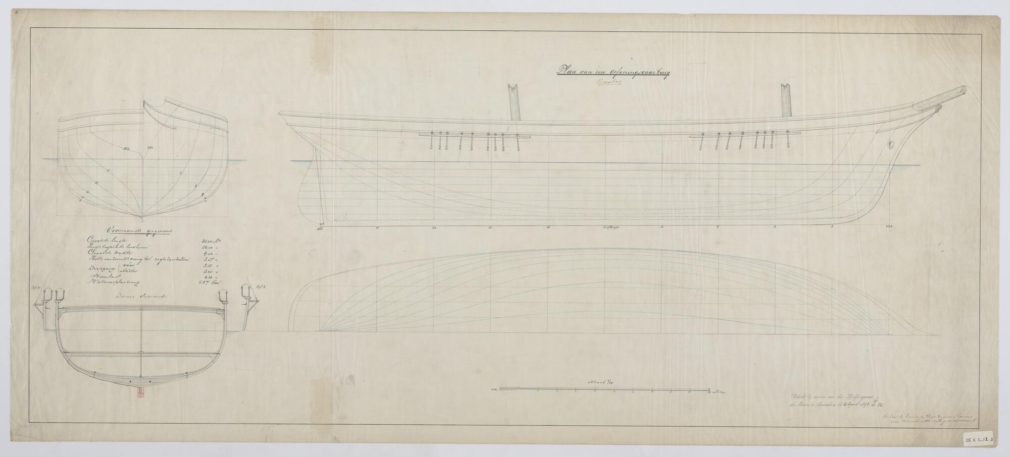 De brik Zr.Ms. "Castor", 1878. grootspant, spantenraam, waterlijnen, verticalen, dwarsdoorsnede.