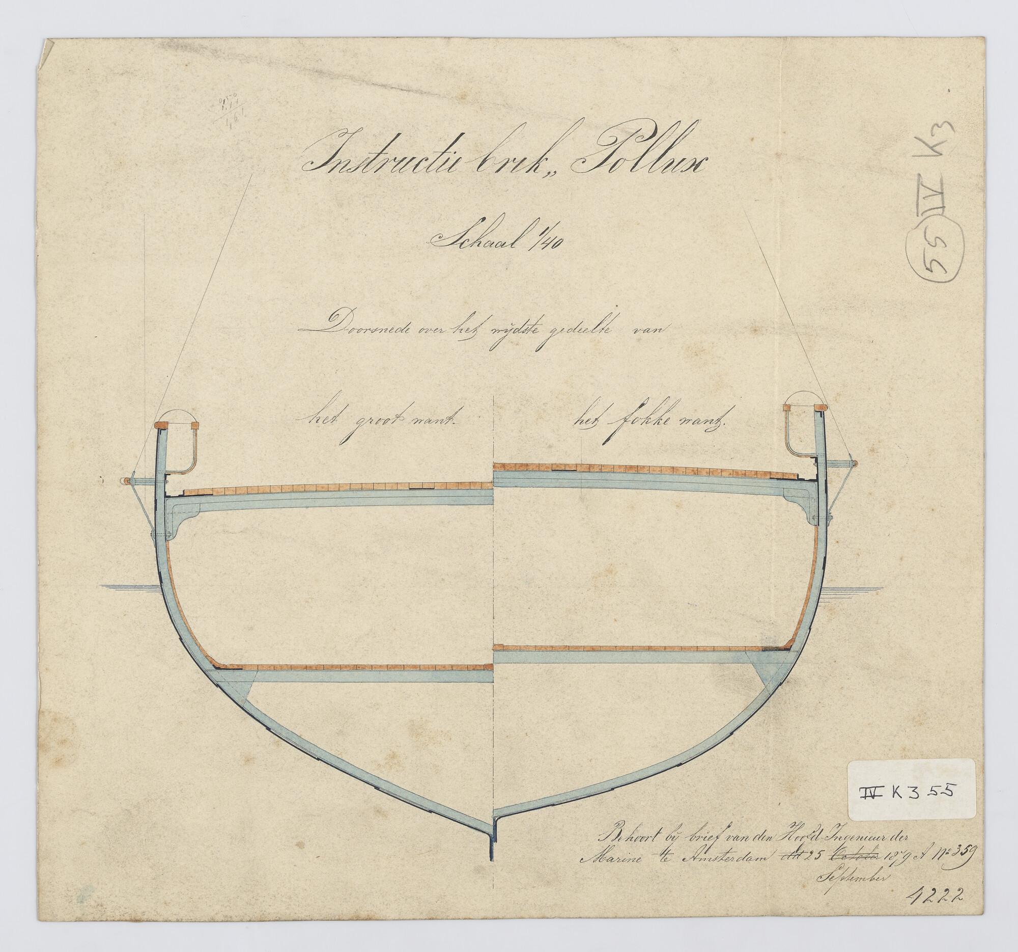 De oefenbrik Zr.Ms. "Pollux", 1879. grootspant, spantenraam, waterlijnen, verticalen, dwarsdoorsnede. (3 tekeningen).