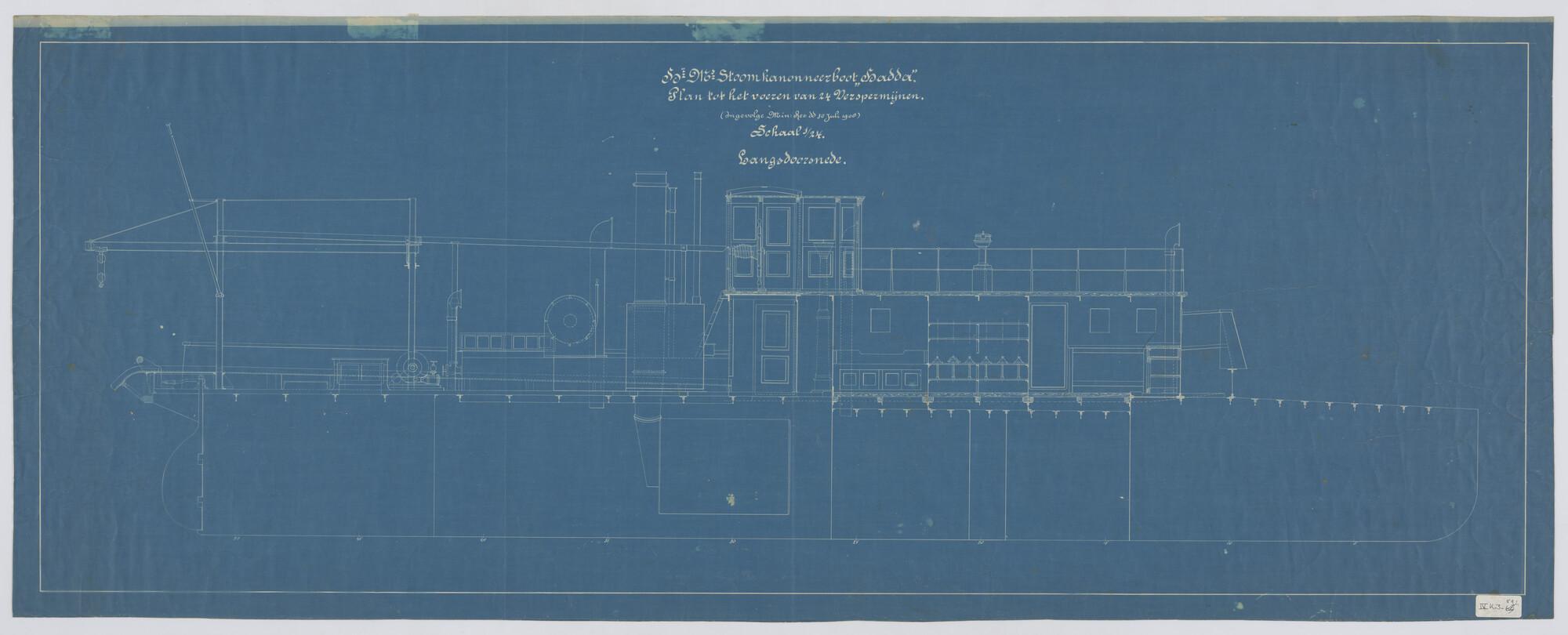 De stoomkanonneerboot Zr.Ms. "Hadda", 1879. In 1908 ombouw tot mijnenlegger. verticale langsdoorsnede, 1908.
