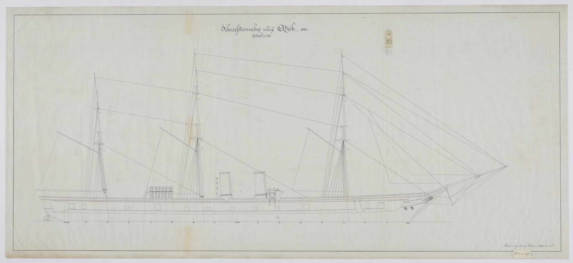 Het schroefstoomschip 1ste klasse Zr.Ms. "Atjeh". 1889. zijaanzicht met tuigplan.