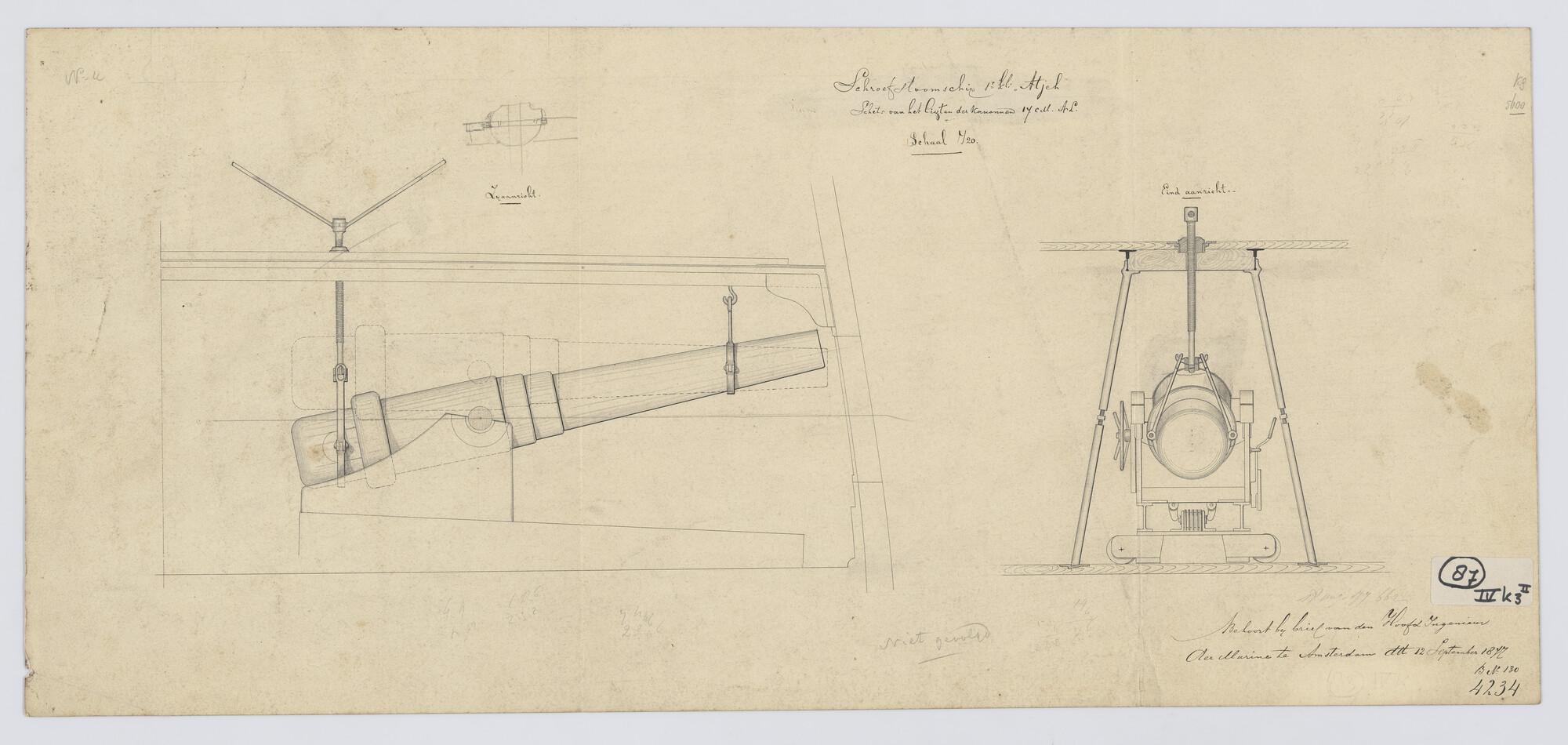 Het schroefstoomschip 1ste klasse Zr.Ms. "Atjeh". Schets van het lichten der kanons zij- en achteraanzicht.
