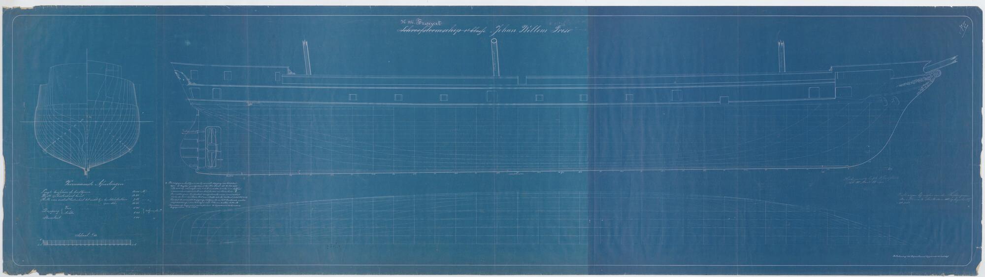 Het schroefstoomschip 1ste klasse Zr.Ms. "Johan Willem Friso", 1883. zijaanzicht, spantenraam, verticalen, waterlijnen.