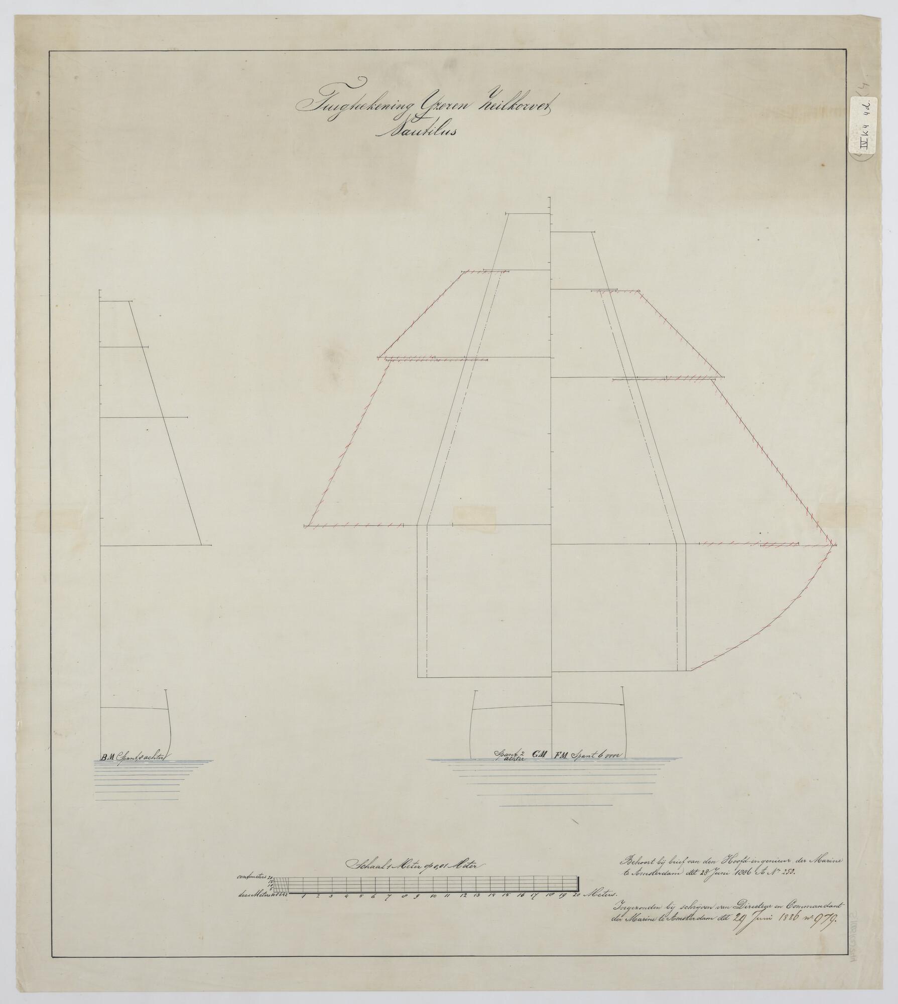 Het zeil-instructiekorvet Zr.Ms. "Nautilus", 1884. Tuigtekening dwarsscheeps.