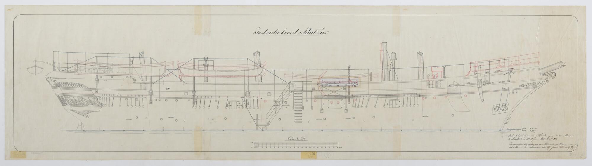 Het zeil-instructiekorvet Zr.Ms. "Nautilus", 1884. zijaanzicht.