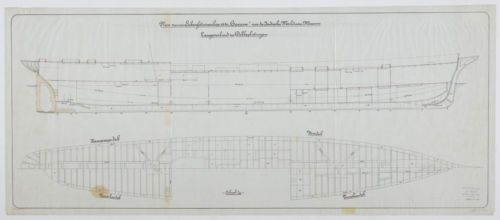 Het schroefstoomschip Zr.Ms. "Ceram", 1886. Langsverband en dekbeplating.