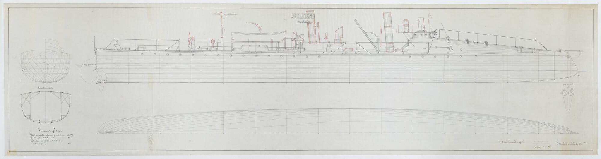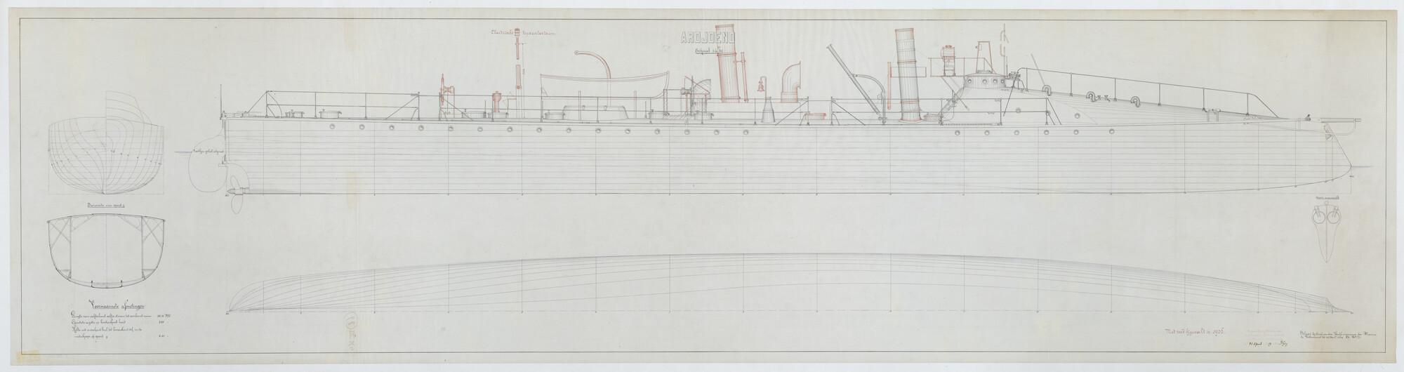 De torpedoboot Zr.Ms. "Ardjoeno", 1886. zijaanzicht, spantenraam, waterlijnen, dwarsdoorsnede.