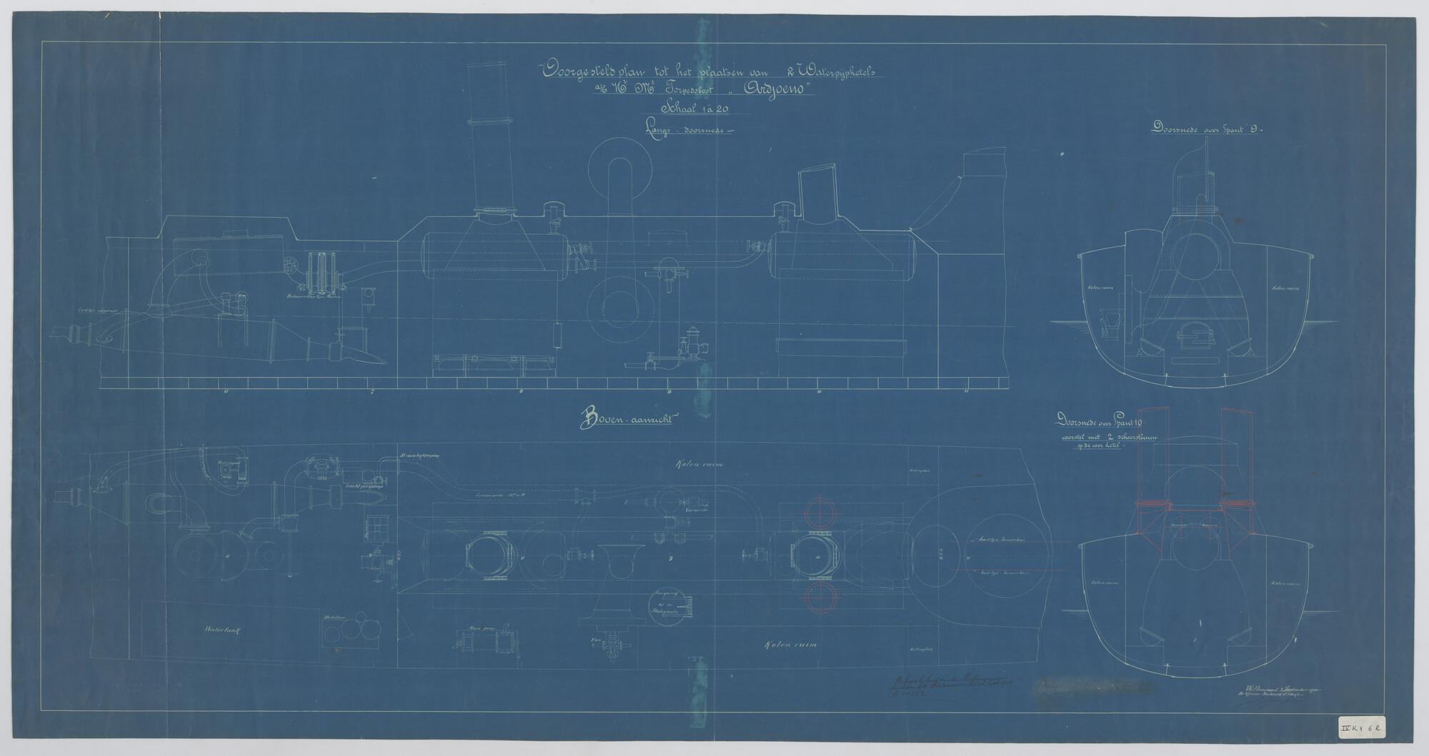 De torpedoboot Zr.Ms. "Ardjoeno", 1886. verticale langsdoorsnede, bovenaanzicht, ter hoogte KR en MK.