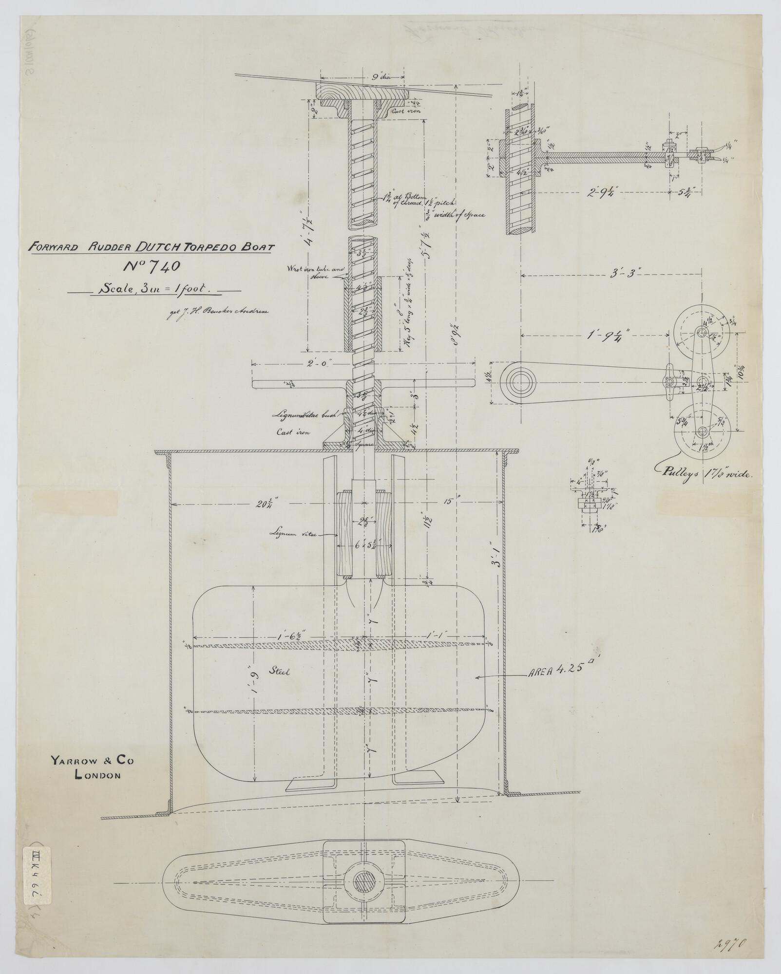 De torpedoboot Zr.Ms. "Ardjoeno", 1886. Voorroer met draaistang voor op en neer beweging, in bun.