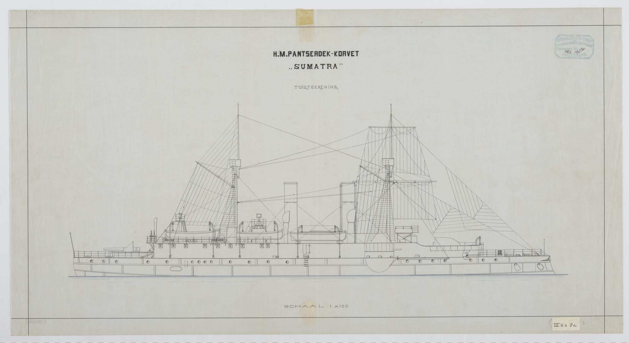 Het pantserdekkorvet Zr.Ms. "Sumatra", 1888. zijaanzicht met tuigtekening.