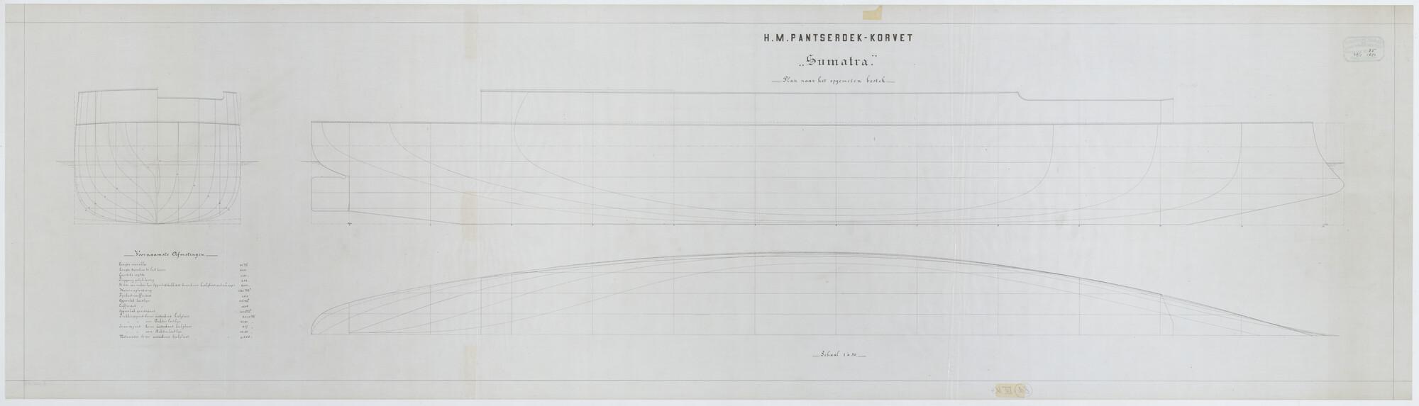 Het pantserdekkorvet Zr.Ms. "Sumatra", 1888. Bestektekening, zijaanzicht, spantenraam, waterlijnen, verticalen.