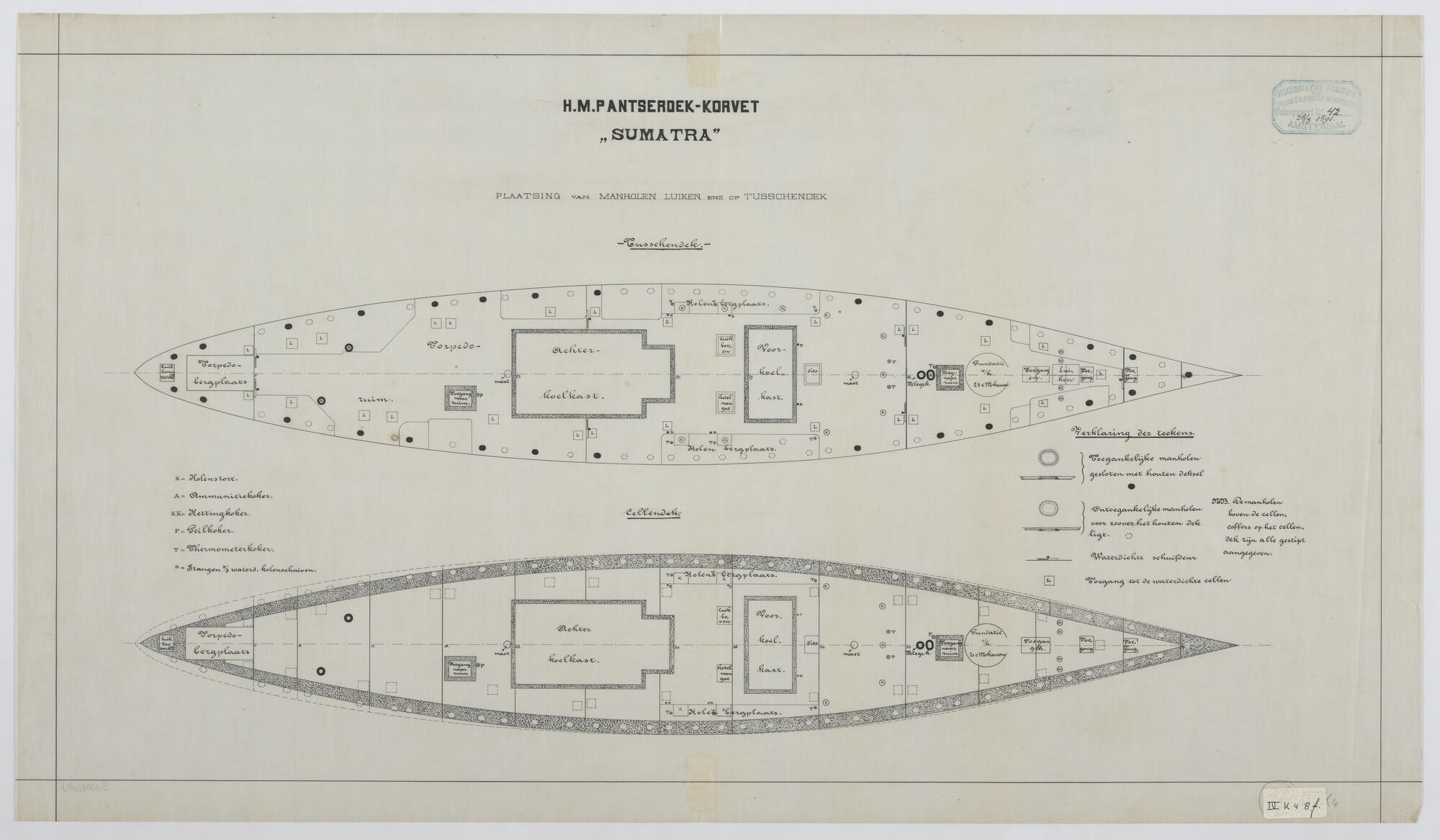 Het pantserdekkorvet Zr.Ms. "Sumatra", 1888. Plaatsing manholen (mangaten), luiken etc. op tussendek.