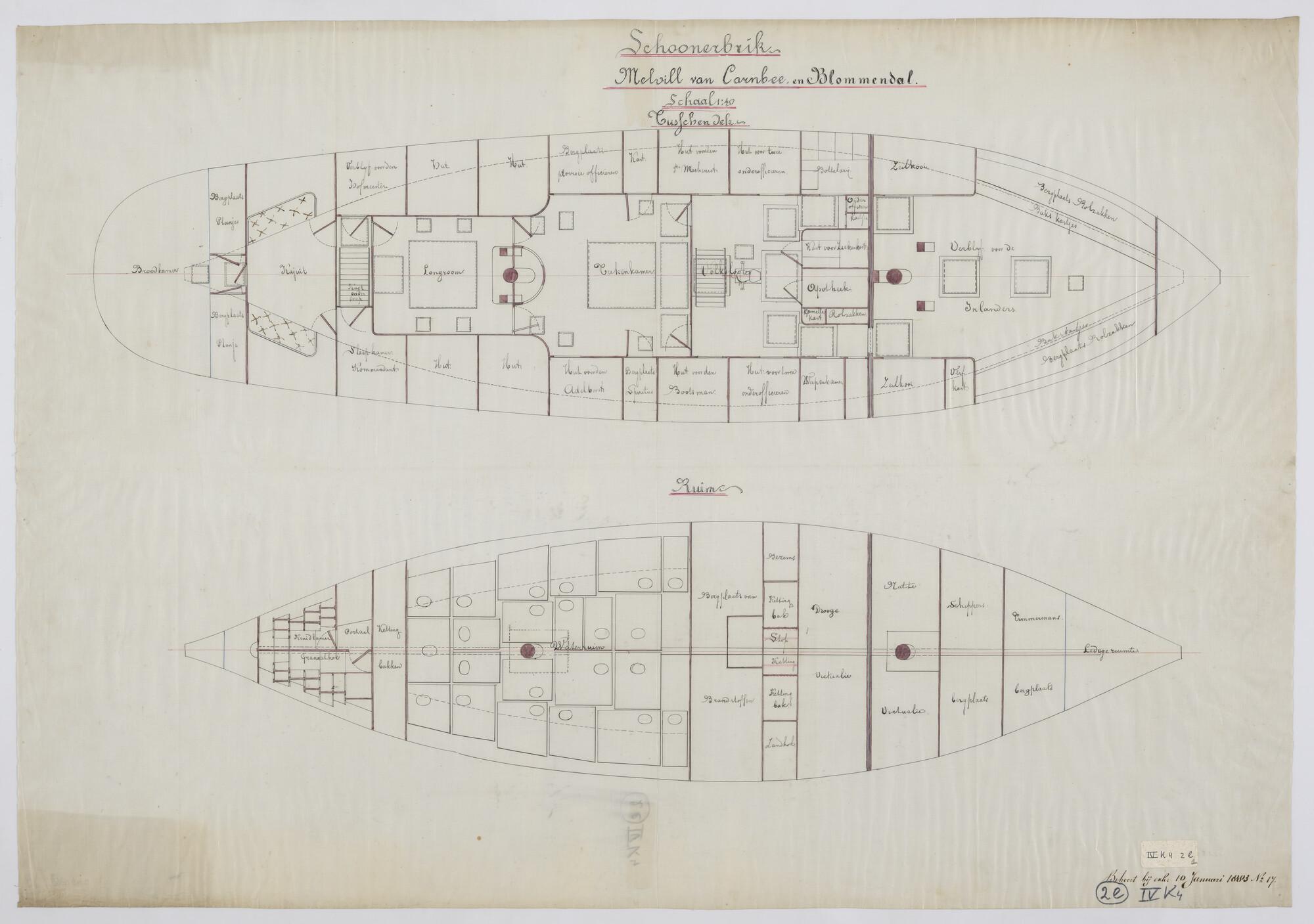 De schoenerbrikken Zr.Ms. "Melvill van Carnbee" en "Blommendal" 1881. Tussendek en ruim.