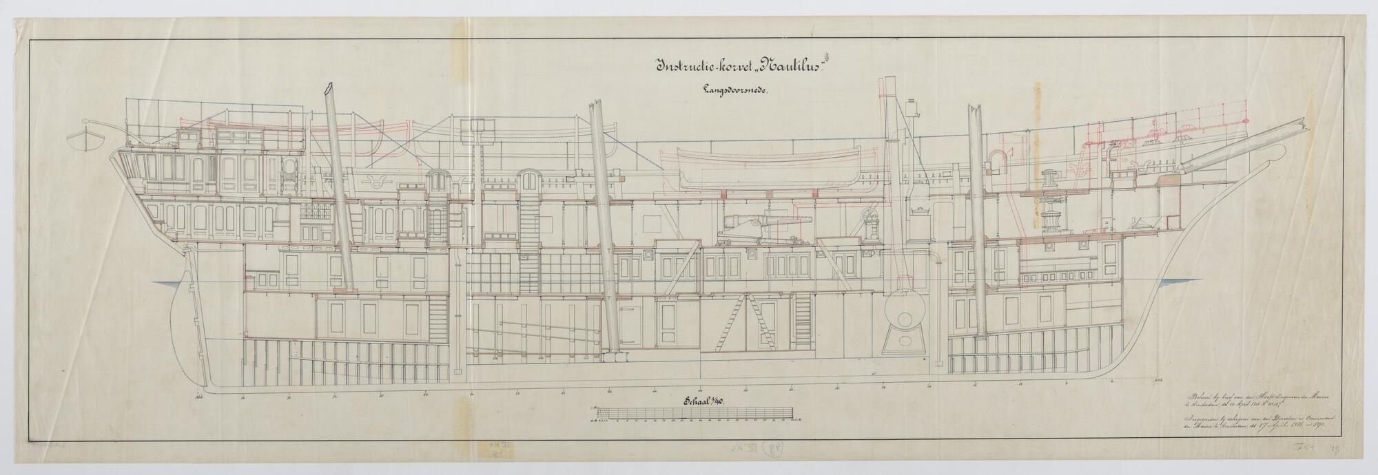 Het zeil-instructiekorvet Zr.Ms. "Nautilus", 1884. verticale langsdoorsnede.