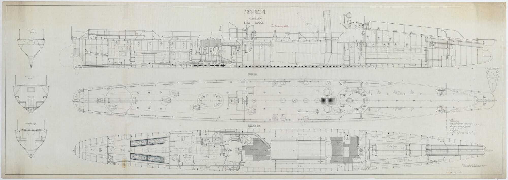 De torpedoboot Zr.Ms. "Ardjoeno", 1886. verticale langsdoorsnede, Opperdek, tussendek dwarsdoorsnede.