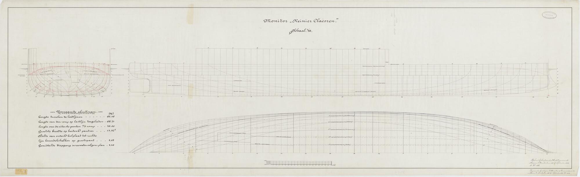 De monitor Zr.Ms. "Reinier Claeszen", 1890. spantenraam, waterlijnen, verticalen.