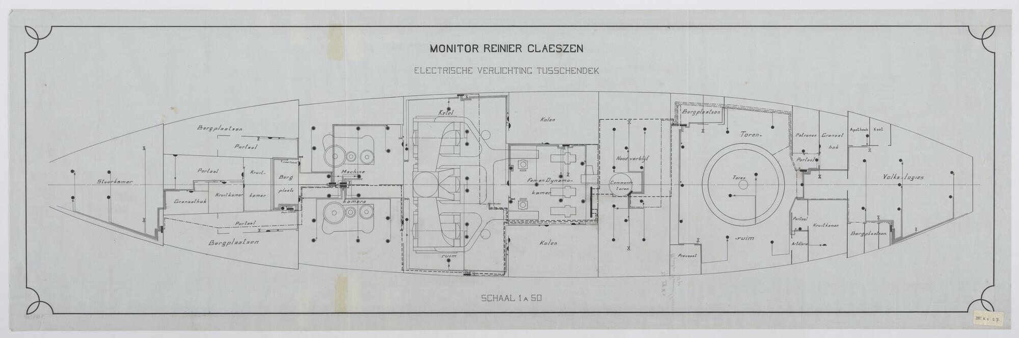 De monitor Zr.Ms. "Reinier Claeszen", 1890. Electrische verlichting tussendek.