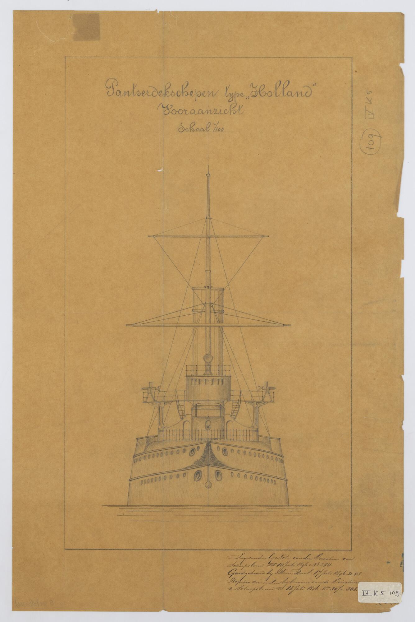 Het pantserdekschip Hr.Ms. "Holland", 1894. vooraanzicht.