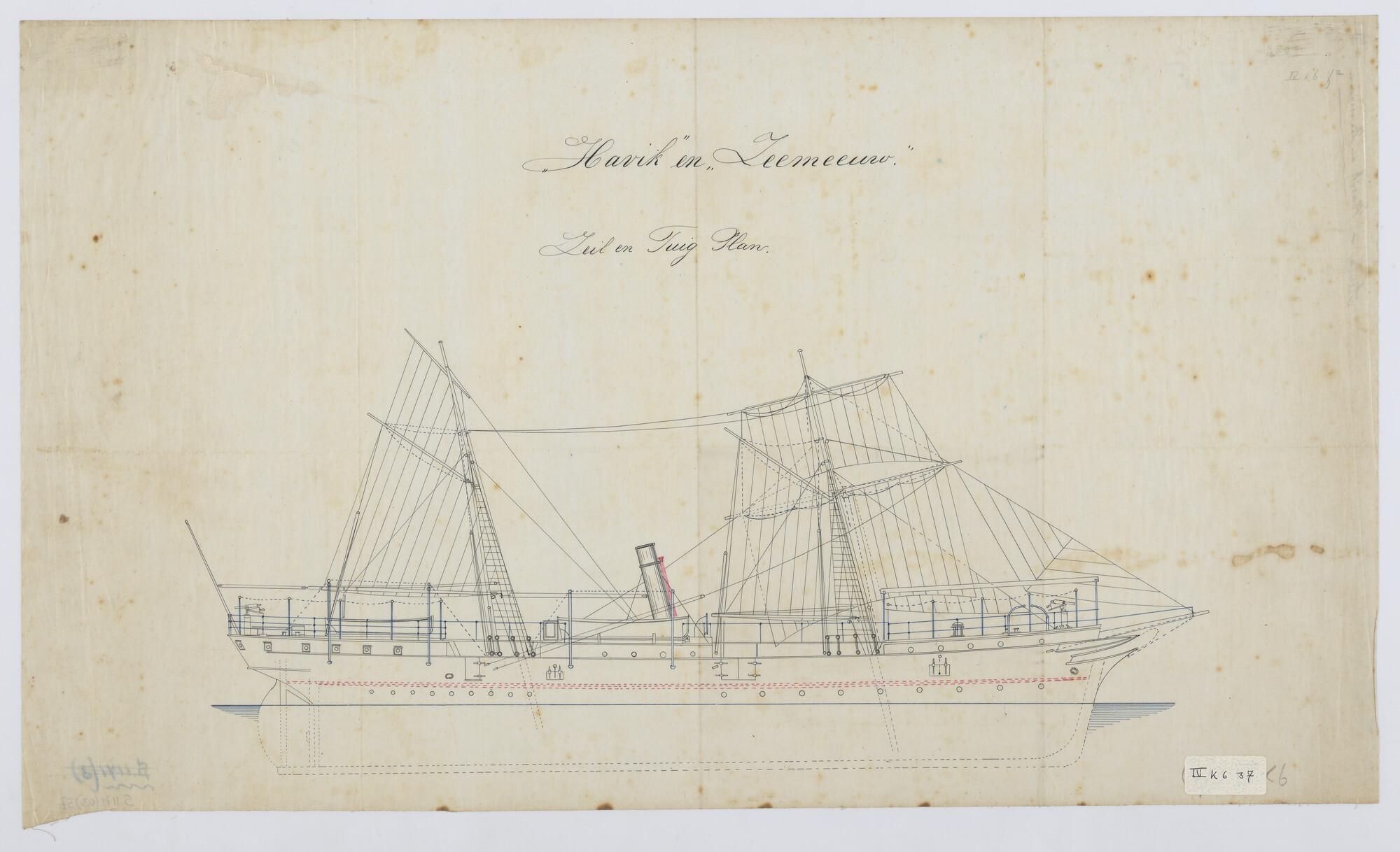 Het schroefstoomschip Zr.Ms. "Havik" en "Zeemeeuw", 1878. zijaanzicht.