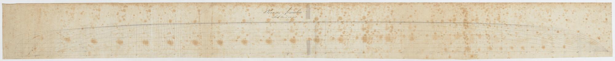 Zijaanzicht, waterlijnen, verticalen en spantenraam van het Schroefstoomschip Prinses Amalia 1874.