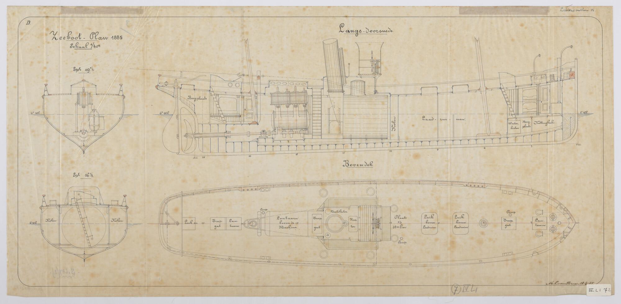 Verticale langsdoorsnede, dwarsdoorsnede en bovendek, Zeeboot