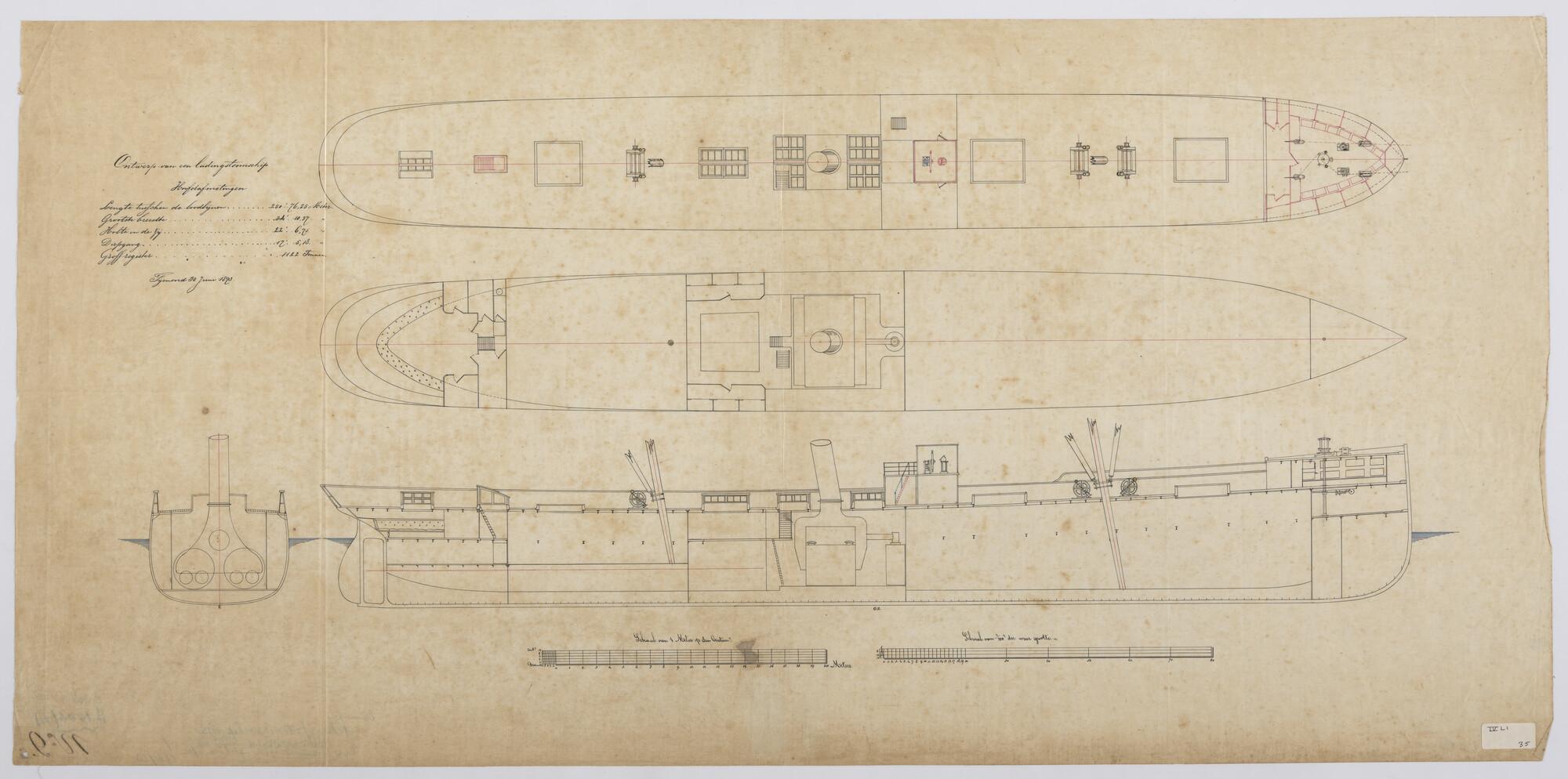 Verticale langsdoorsnede, bovenaanzicht, horizontale langsdoorsnede en grootspant van een vrachtstoomschip 1873, afmetingen 76.25 x 10.37 x 6.75.