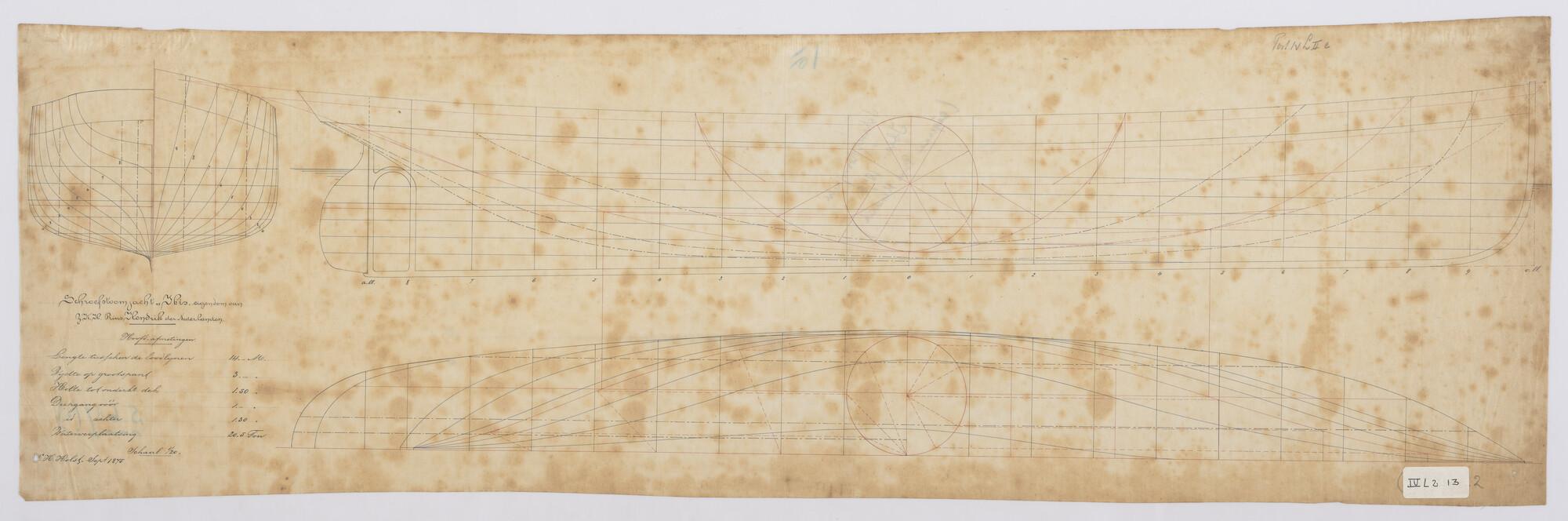 Schroefstoomschip 'Ibis', 1875: lijnenplan, spantenraam, verticalen en waterlijnen