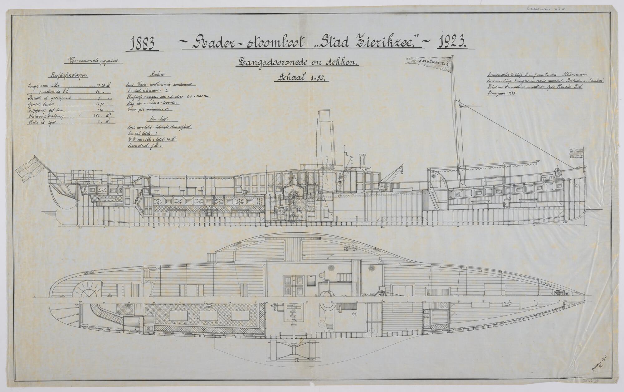 Verticale langsdoorsnede, horizontale langsdoorsnede en bovenaanzicht van de raderstoomboot Stad Zierikzee 1883, afmetingen 50 x 7 x 3 meter.