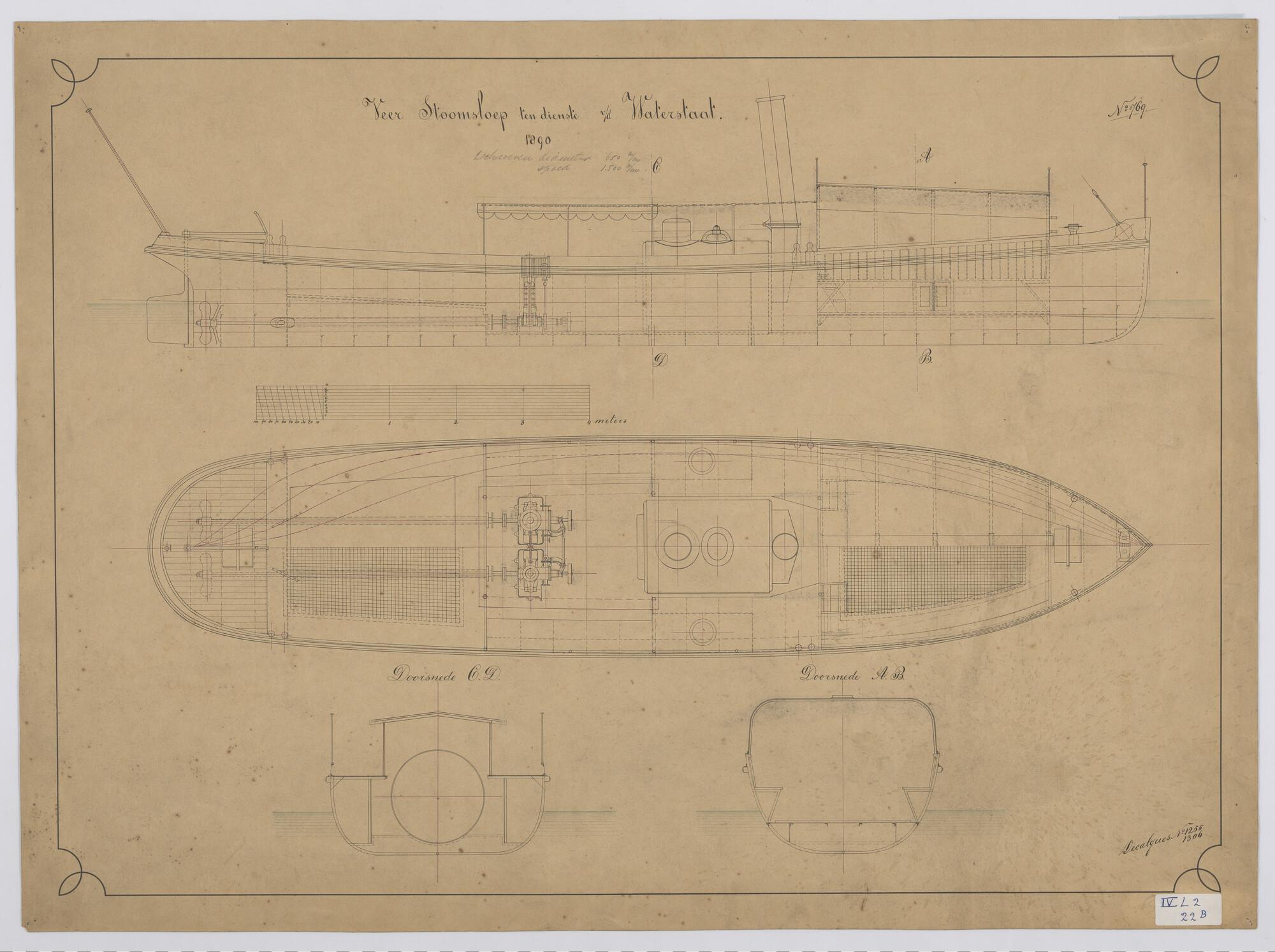 Verticale langsdoorsnede, horizontale langsdoorsnede, dwarsdoorsnede van een veerstoomsloep van de waterstaat 1890.