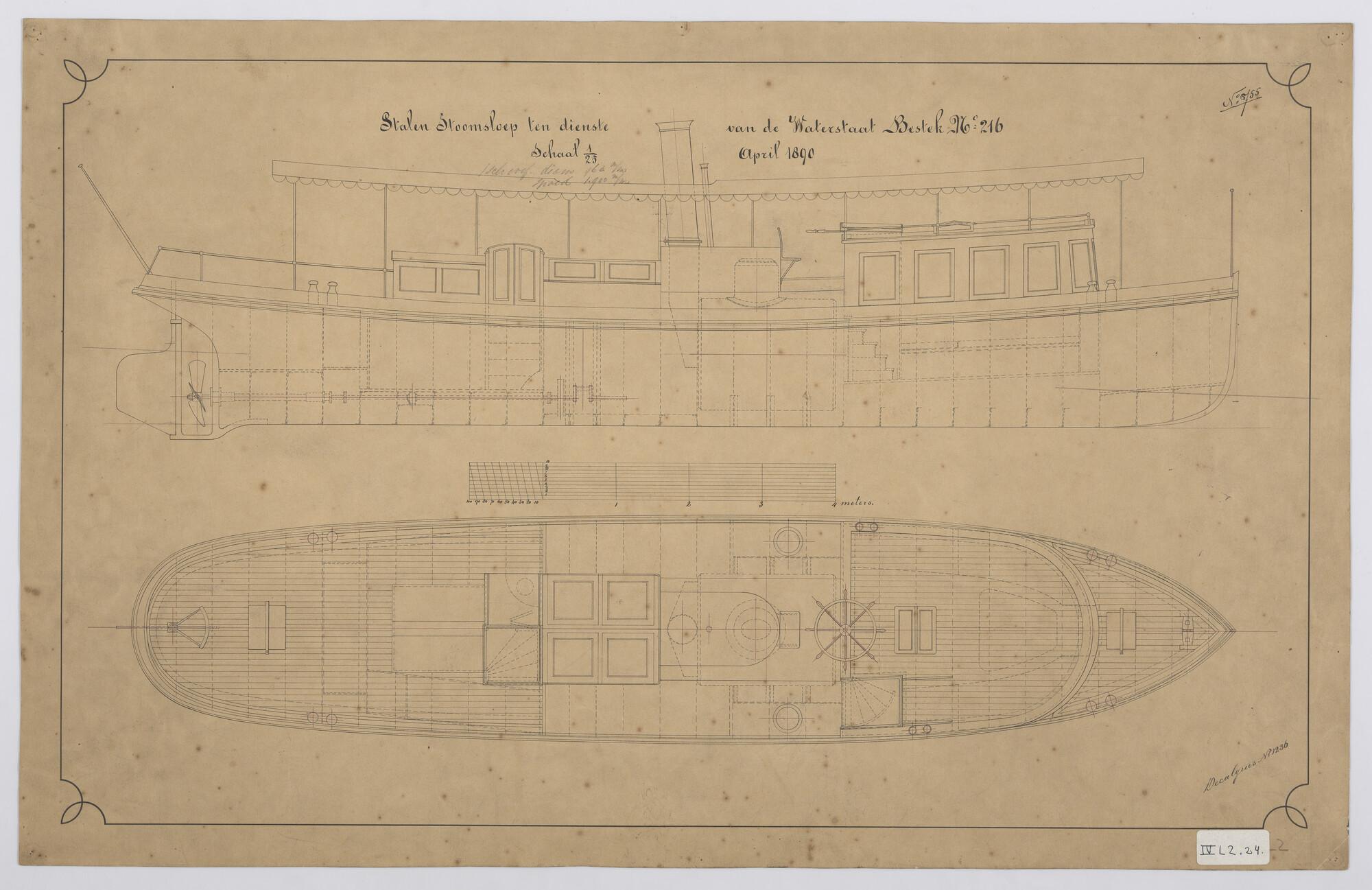 Zijaanzicht en bovenaanzicht van een stalen stoomsloep van de Waterstaat 1890