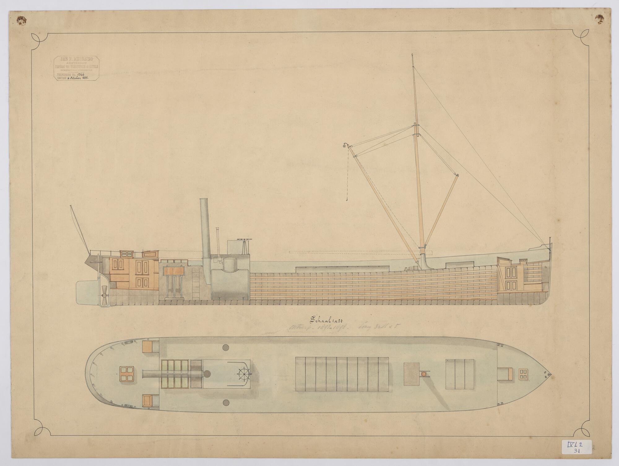 Verticale langsdoorsnede en bovenaanzicht van een schroefstoomschip 1897 - 1898.