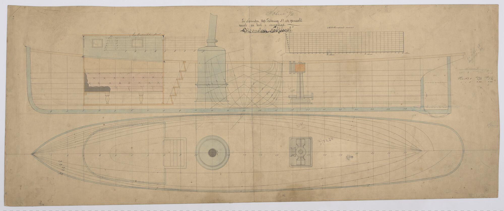 Stoomsloep 'Nachtegaal', 1893: verticale langsdoorsnede, bovenaanzicht, spantenraam en waterlijnen