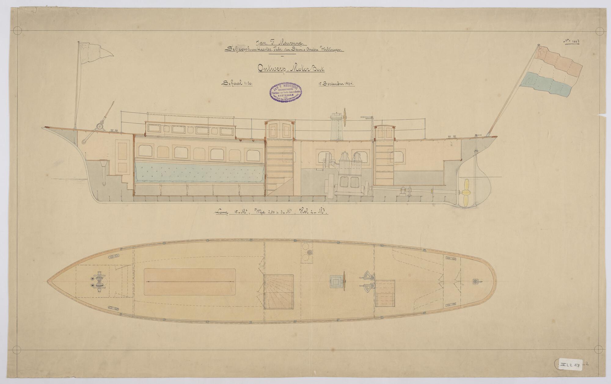 Verticale langsdoorsnede en bovenaanzicht van een ontwerp motorboot 1894, afmetingen 15 x 2.80 x 2 meter.