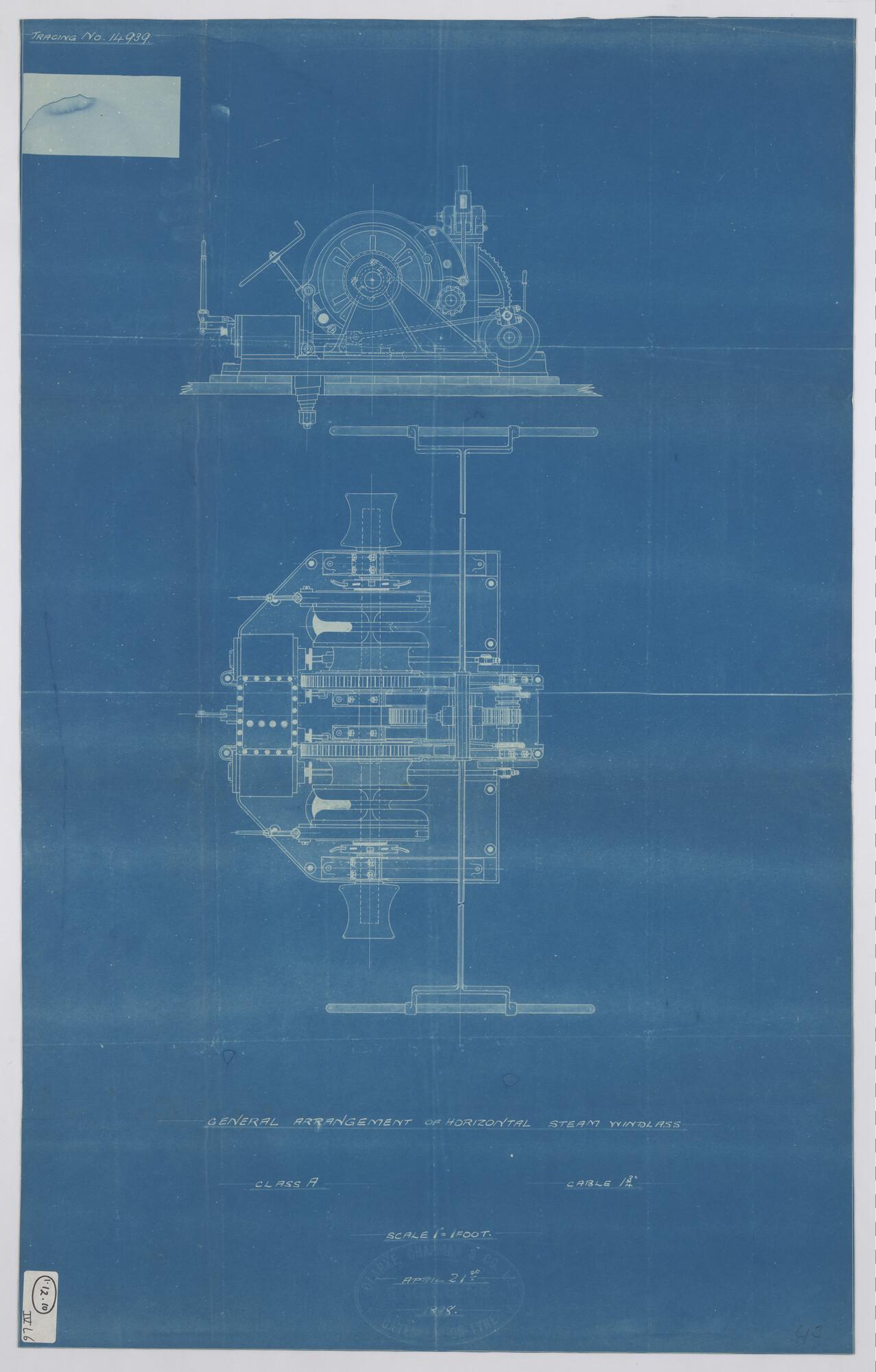 Het vrachtschip ss. "Mossel" van de Koninklijke Paketvaart-Maatschappij. Zijaanzicht en bovenaanzicht. Patent Horizontal steam windlass (Clark-Chapman).