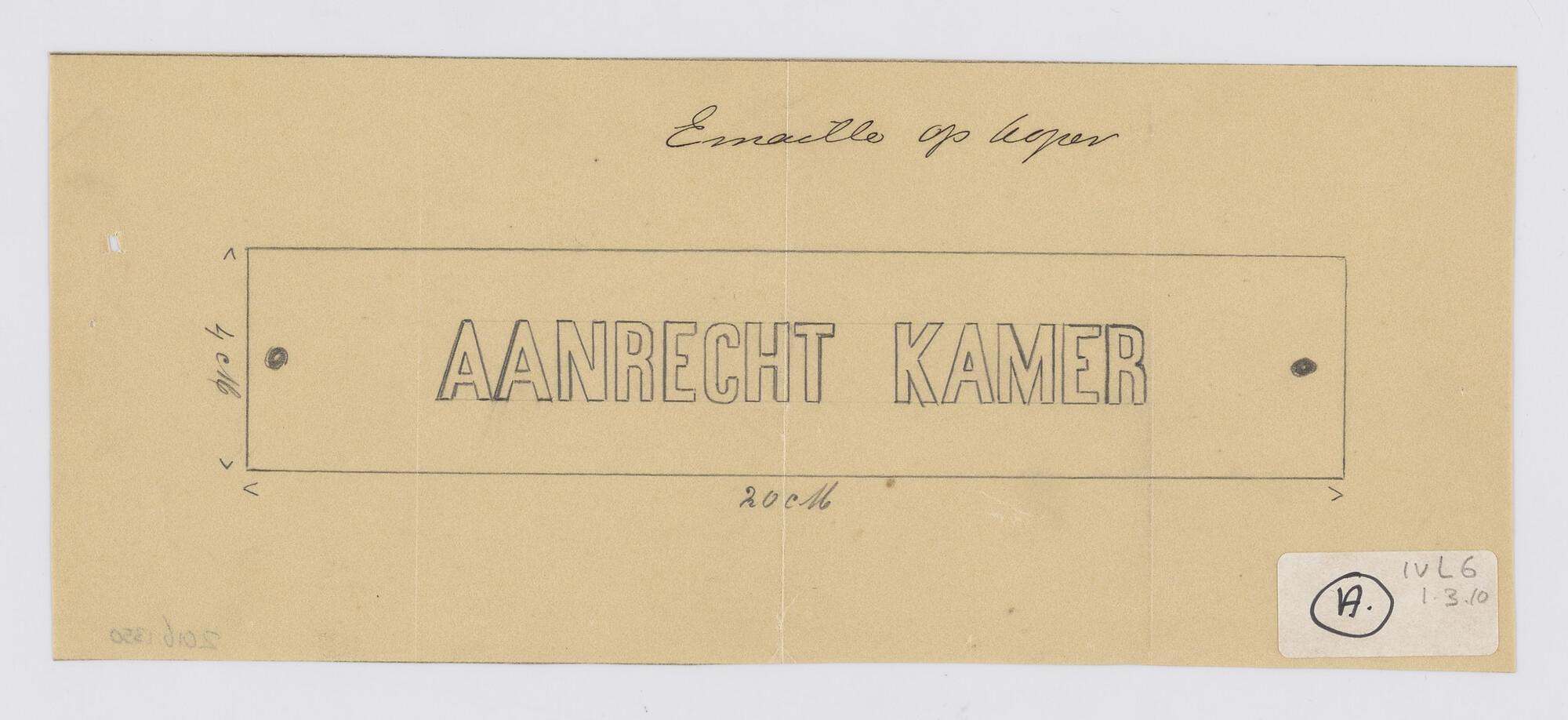 Ontw. plaatje: 'Aanrecht Kamer' voor de vracht- en passagiersschepen ss. "De Carpentier" en het ss. "Van Diemen" van de Koninklijke Paketvaart-Maatschappij.