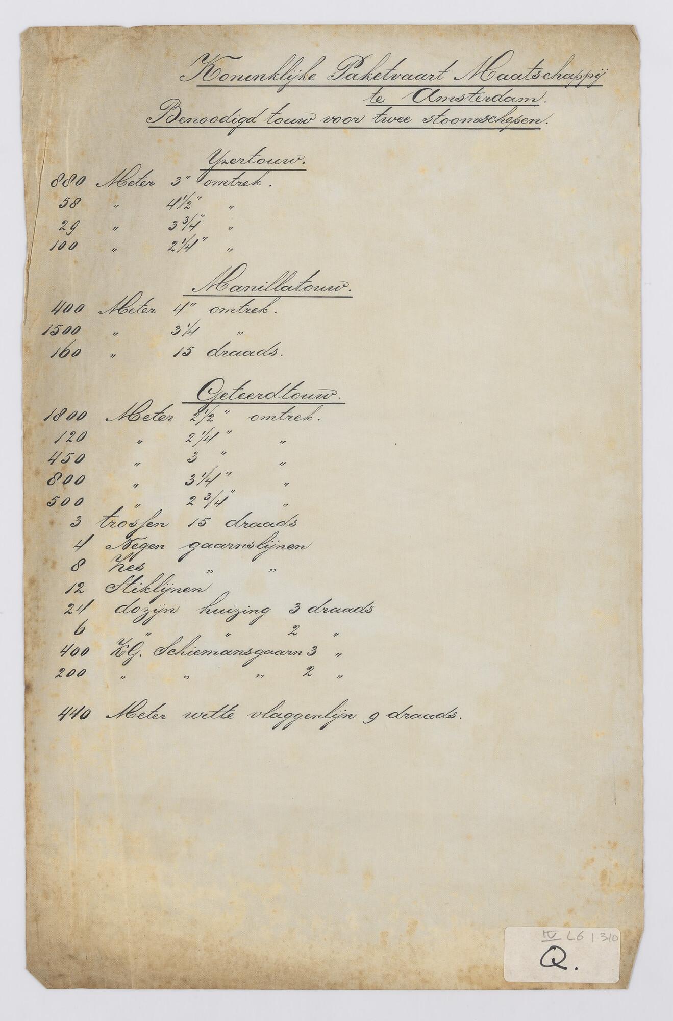 Benodigd touw voor twee stoomschepen voor de vracht- en passagiersschepen ss. De Carpentier en het ss. Van Diemen van de Koninklijke Paketvaart-Maatschappij.