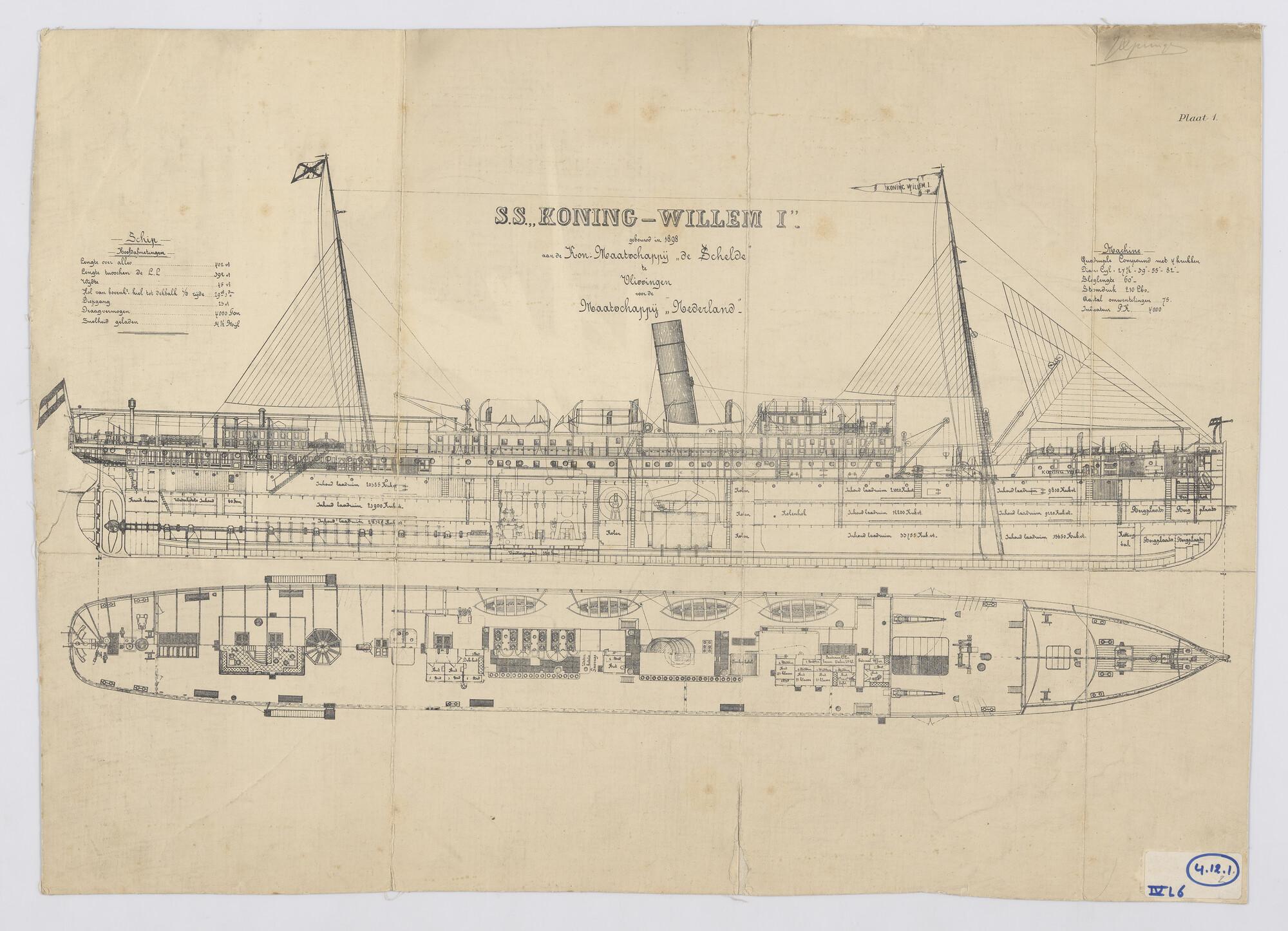 Het passagiersschip ss. "Koning Willem I" van de Stoomvaart-Maatschappij "Nederland" (SMN). Zijaanzicht, verticale langsdoorsnede, bovenaanzicht en horizontale langsdoorsnede.