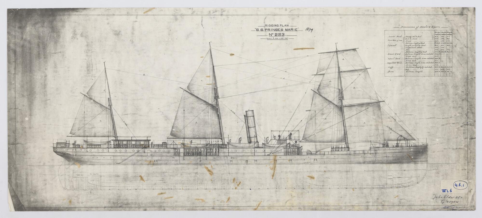 Zijaanzicht en tuigplan van het vracht-passagiersschip ss. Prinses Marie van de Stoomvaart-Maatschappij Nederland (SMN), 1878.