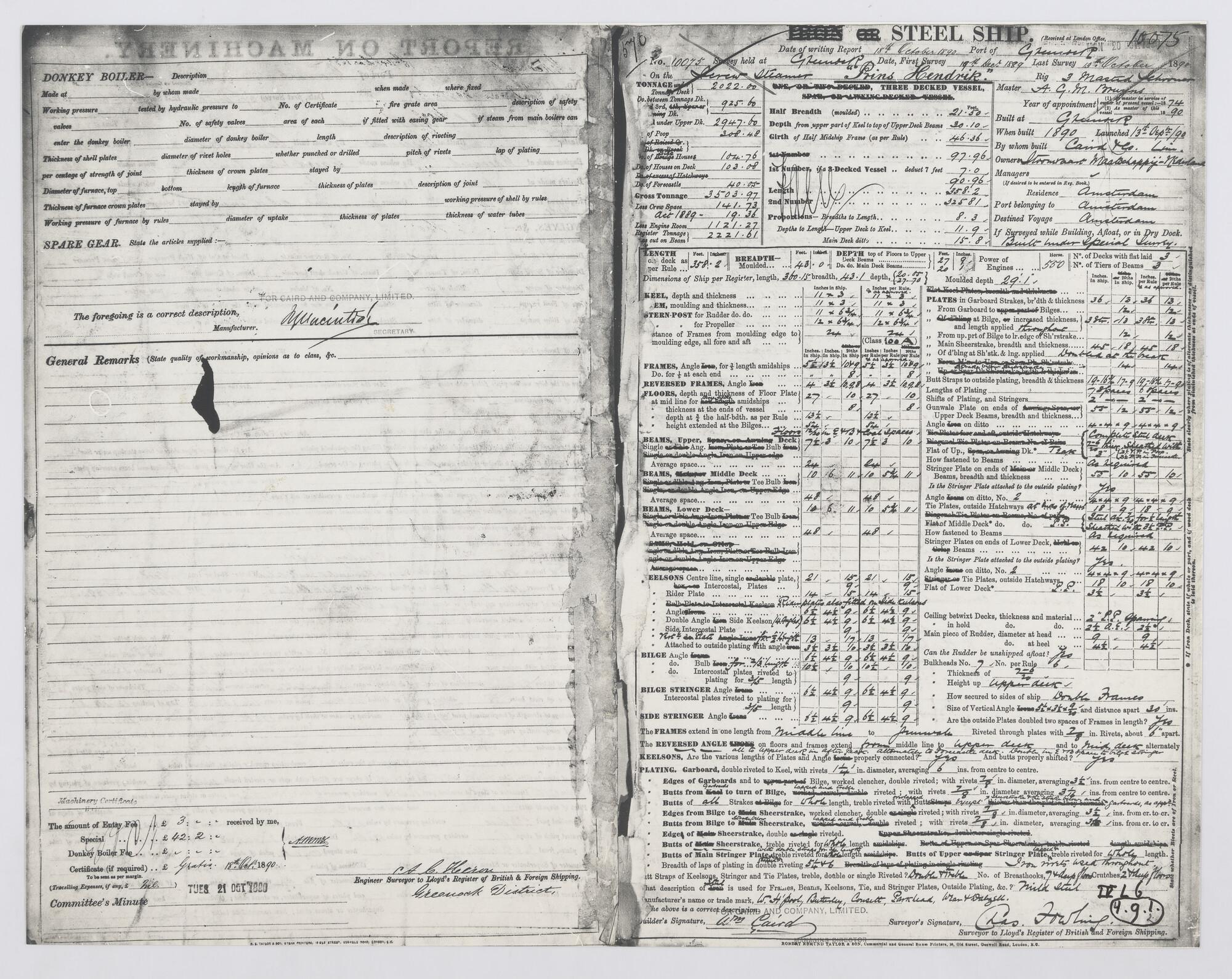 Lloyds rapport over schip en machines. "Prins Hendrik" 1890.