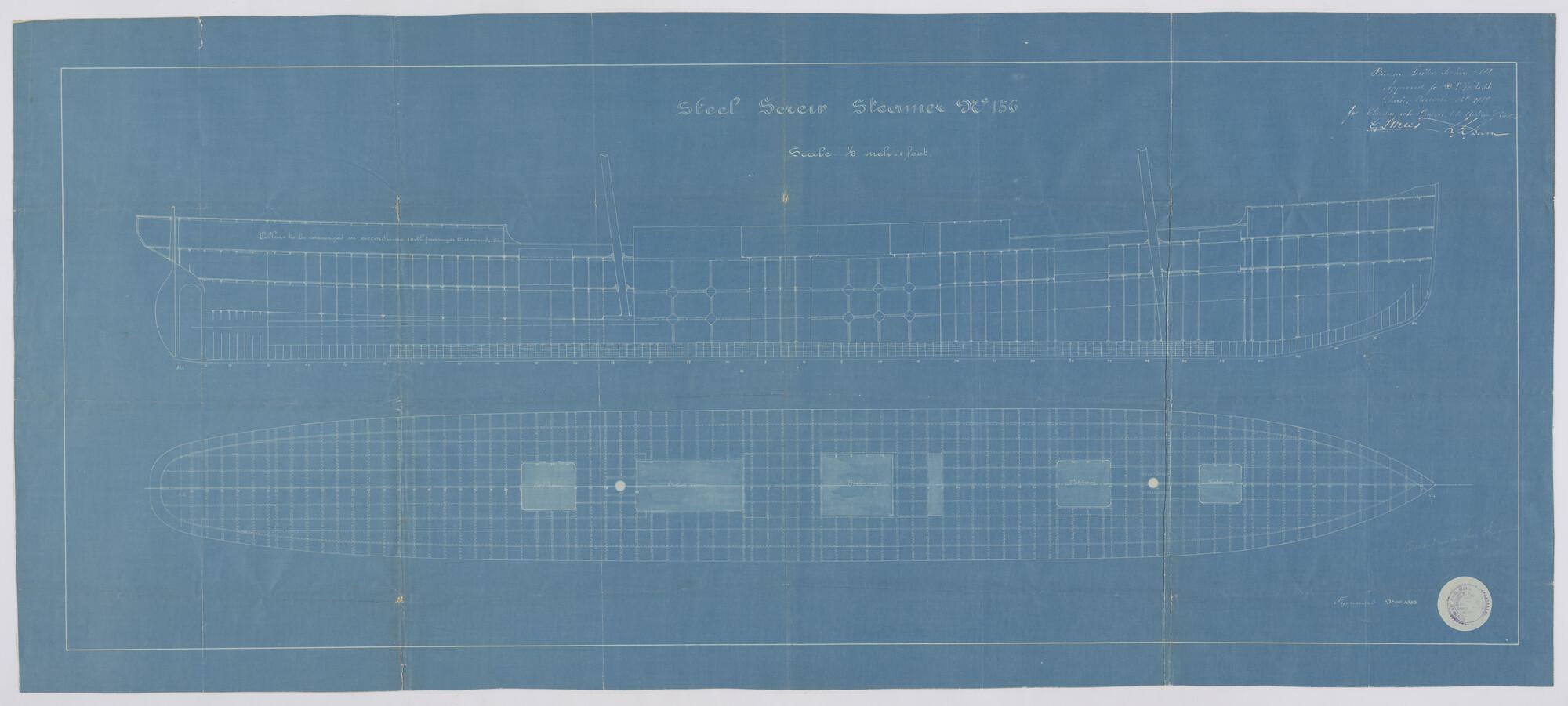 Lijneneplan van het ss. "Didam" van de Holland-Amerika Lijn, 1889.
