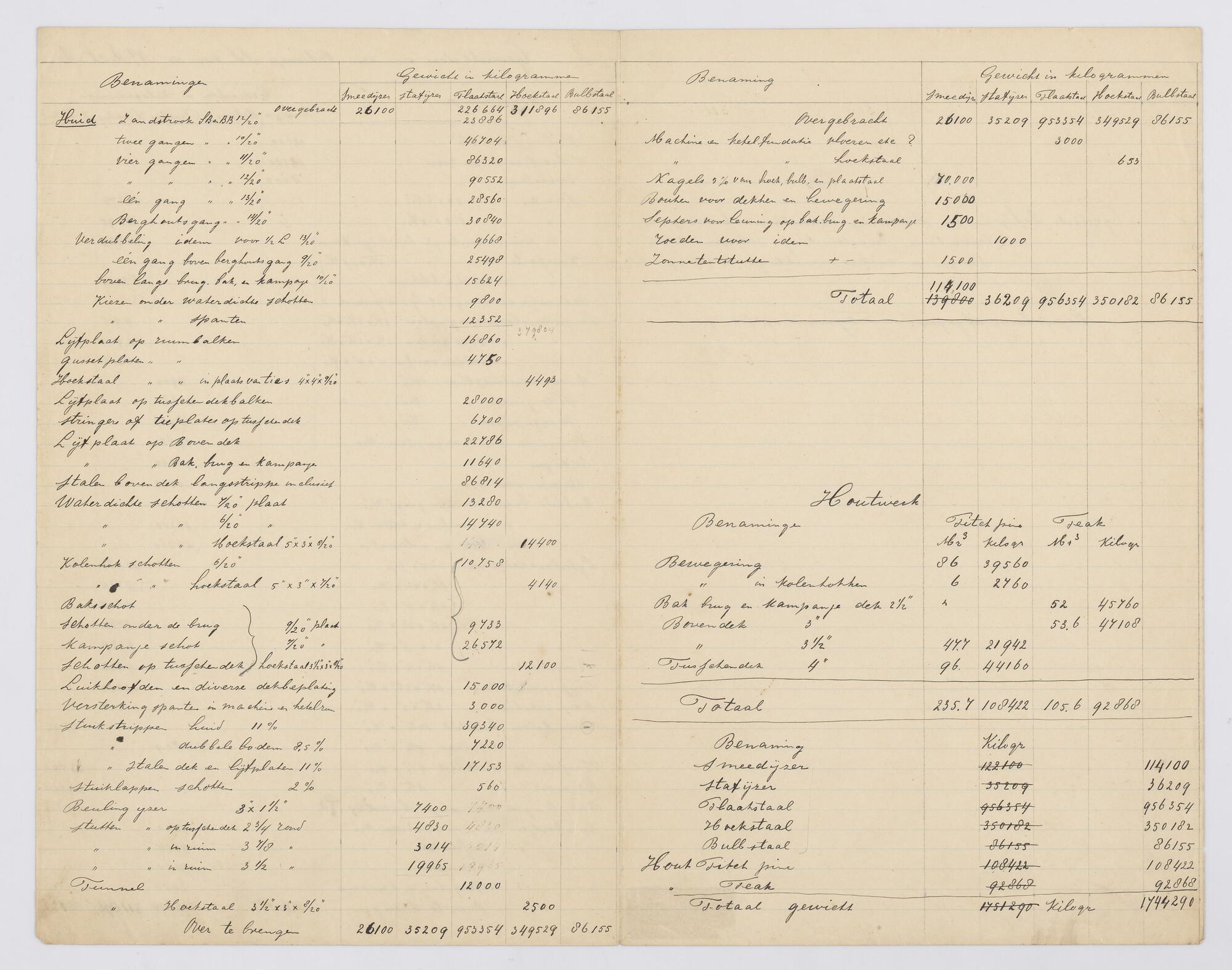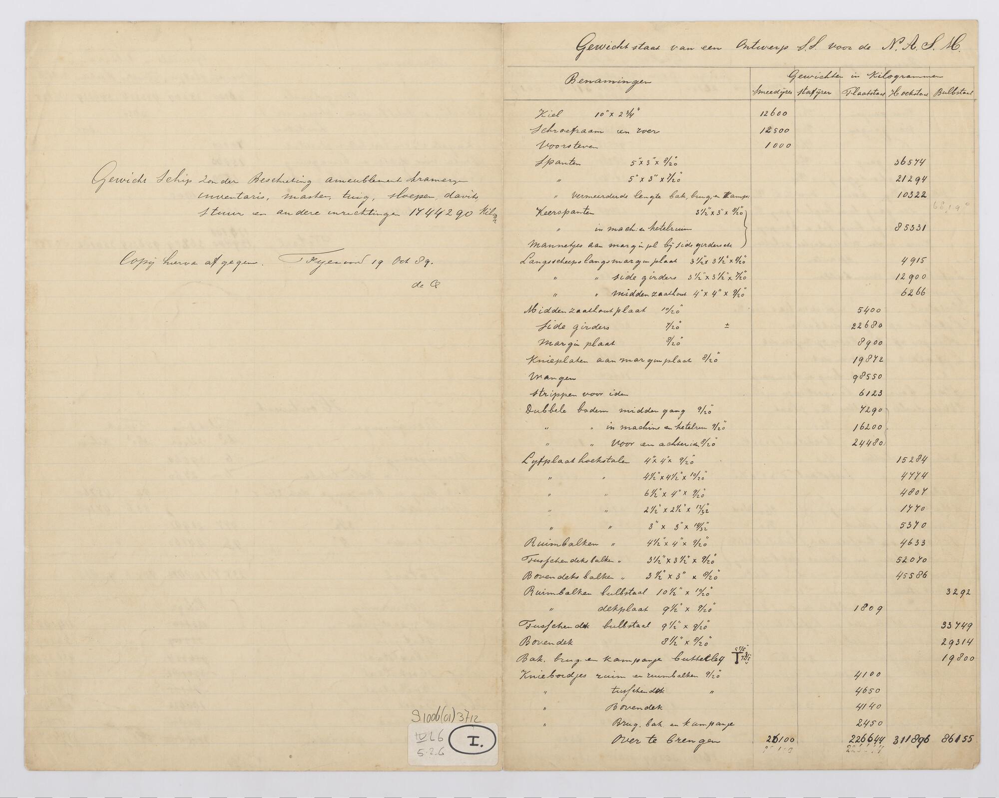 Algemene gegevens van het ss. "Didam" van de Holland-Amerika Lijn. Gewichtsstaat van een ontwerp ss. voor de NASM.