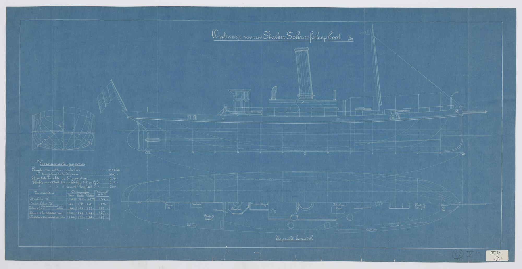 Zijaanzicht, bovenaanzicht, spantenraam, waterlijnen en verticalen van een sleepboot, afmetingen 28 x 5.50 x 3.10 meter.