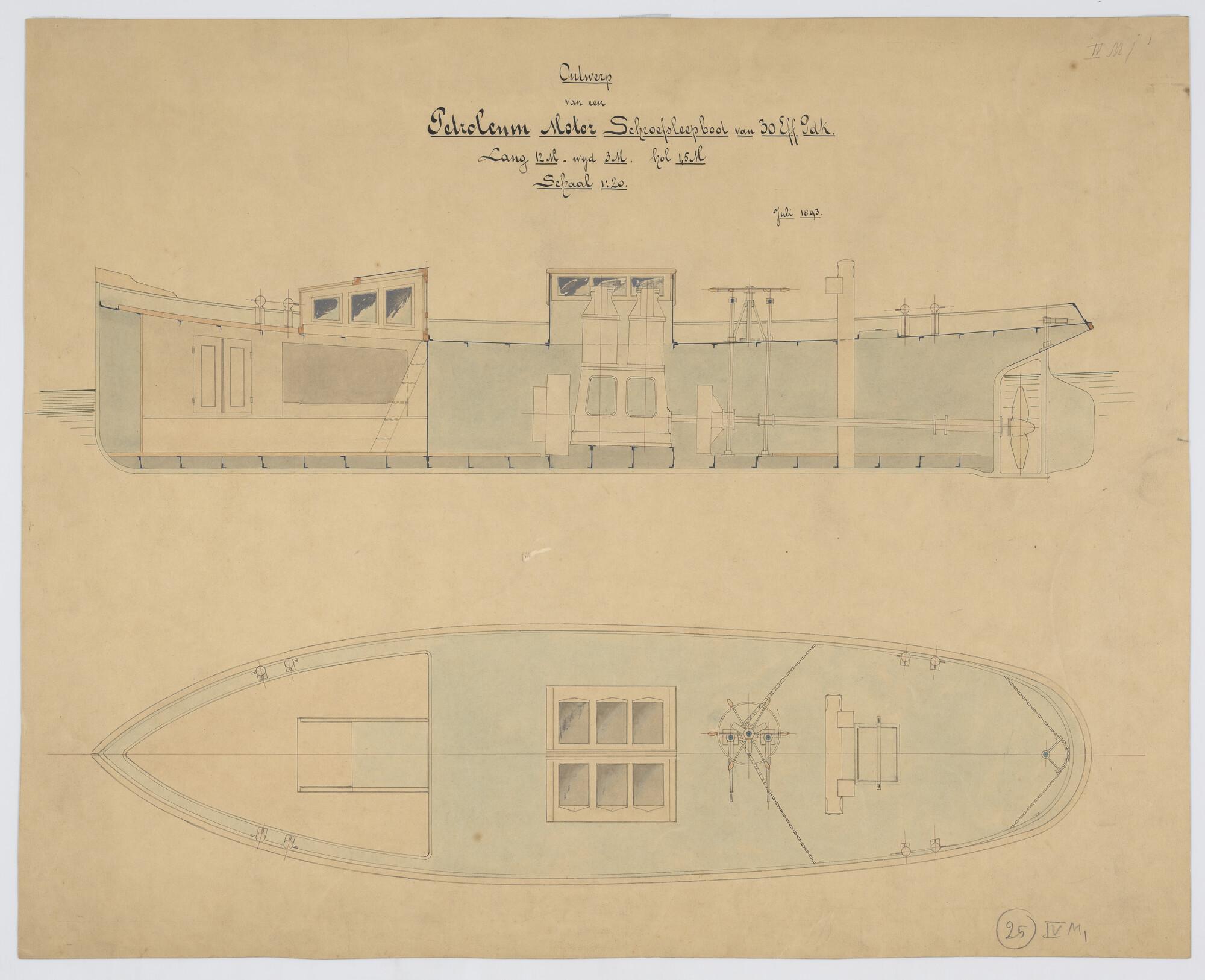 Verticale langsdoorsnede en bovenaanzicht van een schroefsleepboot met petroleummotor 1893 [...]