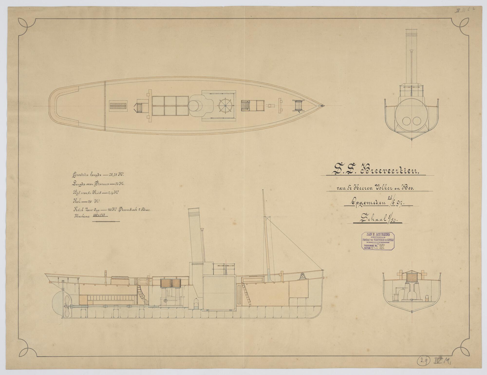 Bovenaanzicht, verticale langsdoorsnede en dwarsdoorsnede van de sleepboot Breeveertien 1897, afmetingen 23 x 5.14 x 3 meter.