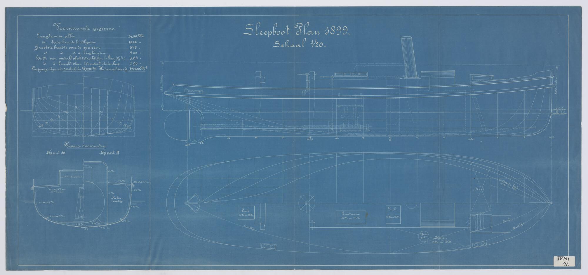 Zijaanzicht, bovenaanzicht, dwarsdoorsnede, spantenraam, waterlijnen, verticalen en senten van een sleepboot plan 1899, afmetingen 14.50 x 3.78 x 1.63 meter.