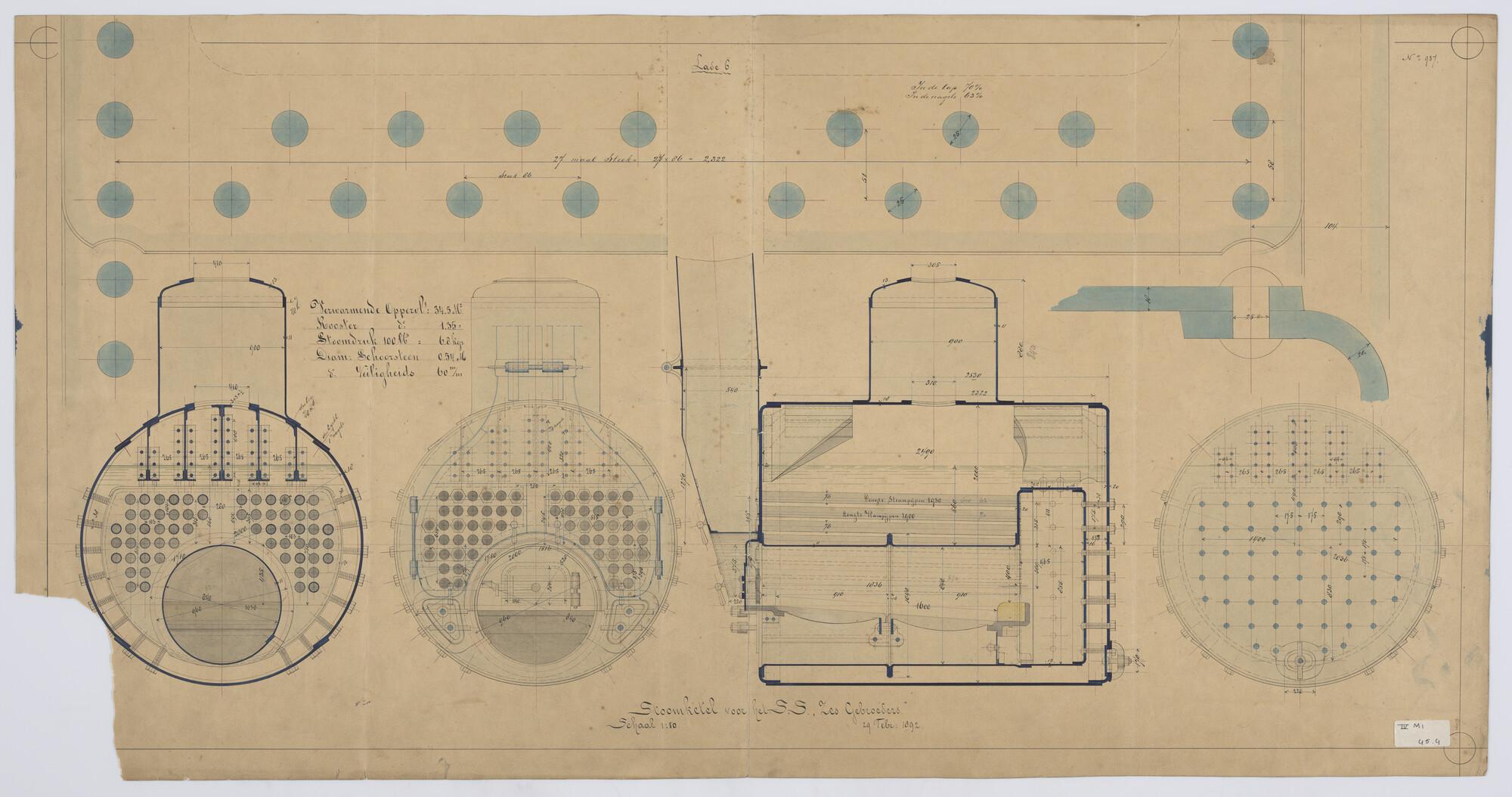 Zijaanzicht, verticale langsdoorsnede, dwarsdoorsnede, 1892. Ketel verticale langsdoorsnede en vooraanzicht, (Schots 1 vuurhaard). Sleepboot "Zes Gebroeders" met bestek.