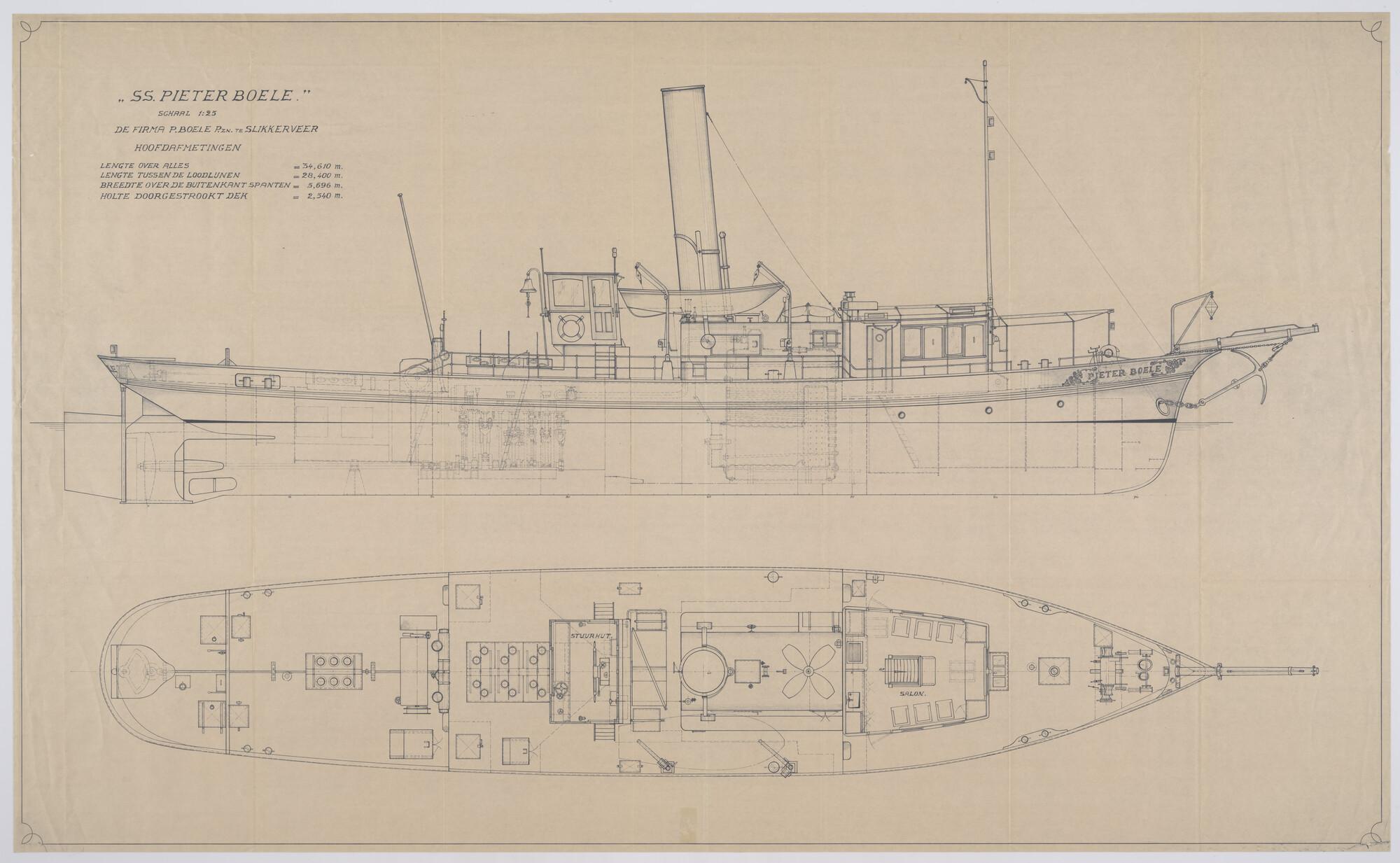 Zijaanzicht en bovenaanzicht van de stoomsleepboot Pieter Boele (1893)